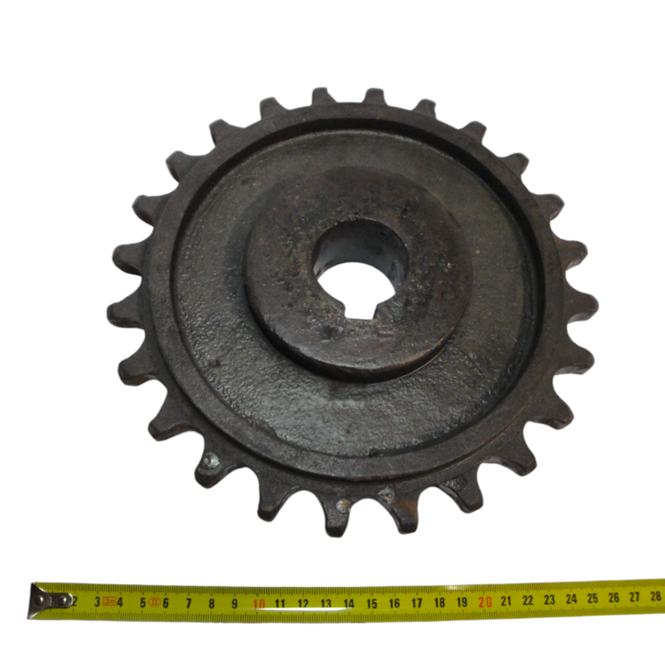 Set van twee grote metalen kettingwielen en een tandwiel. Datering: onbekend. Conditie: prima. Afmetingen: ca. ø31,0 x 13,0 cm en ø22.0 x 5.0 cm. Afmetingen tandwiel: ø28,0 x 4,5 cm.