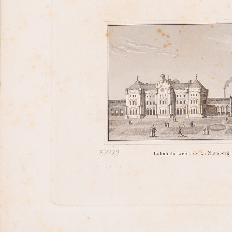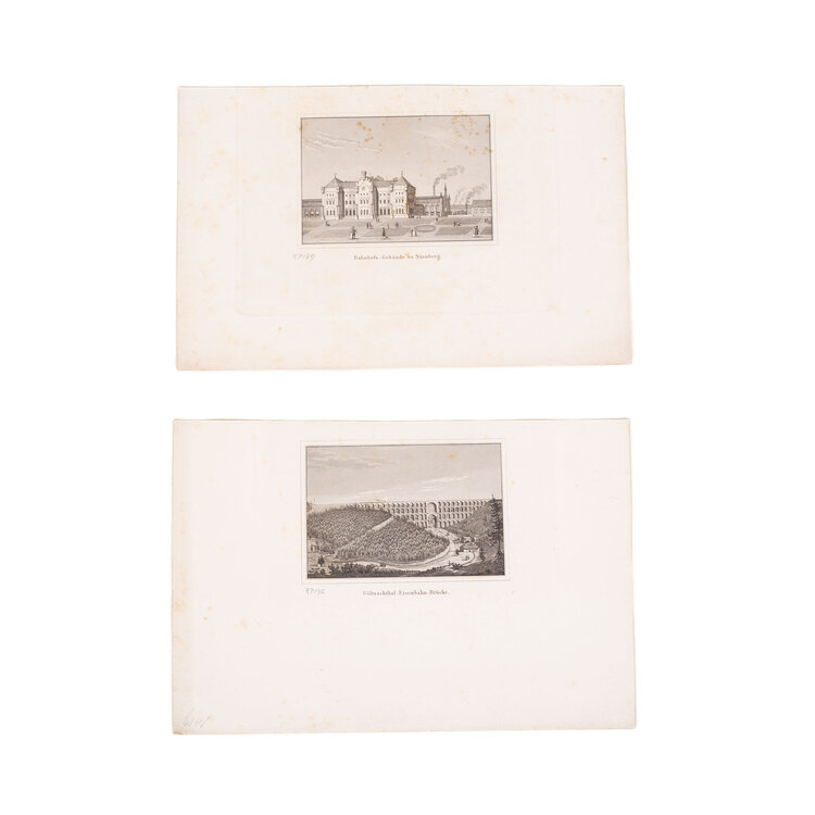 Twee kleine prenten van Duitsland: 'Göltzschthal-Eisenbahn-Brücke'. Ets en gravure van een landschap waar een stoomtrein een spoorwegviaduct oversteekt. Datering onbekend; 'Bahnhofs-Gebaüde zu Nürnberg'. Ets en gravure van het treinstation van Neurenberg in 1844. Datering: circa 1844. Conditie: De prenten hebben sporen van ouderdom. Verkleuring, vlekken en kleine beschadigingen aan de randen. Afmetingen beeldvlak: ca. 7,5 x 10,5 cm.