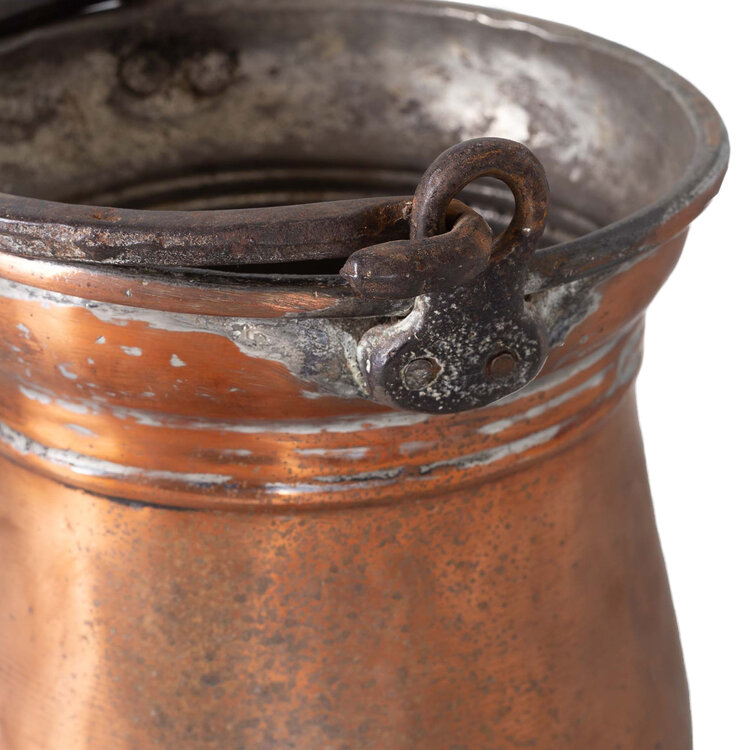 Twee koperen pannen, rond met ingesnoerde hals en vlakke bodem. Aan hals twee metalen ogen waaraan half-ronde ijzeren scharnierende handgreep. De grote pan is aan buitenzijde gepatineerd en de kleine heeft een mooie koperkleur. Bij de grote pan is de binnenzijde zwart geverfd. Vlakke bodem. Conditie: redelijk, deuken en aanslag en van de grote pan is de verf aan binnenzijde deels afgebladerd. Afmetingen: 27 x 30,5 x 26,5 cm.