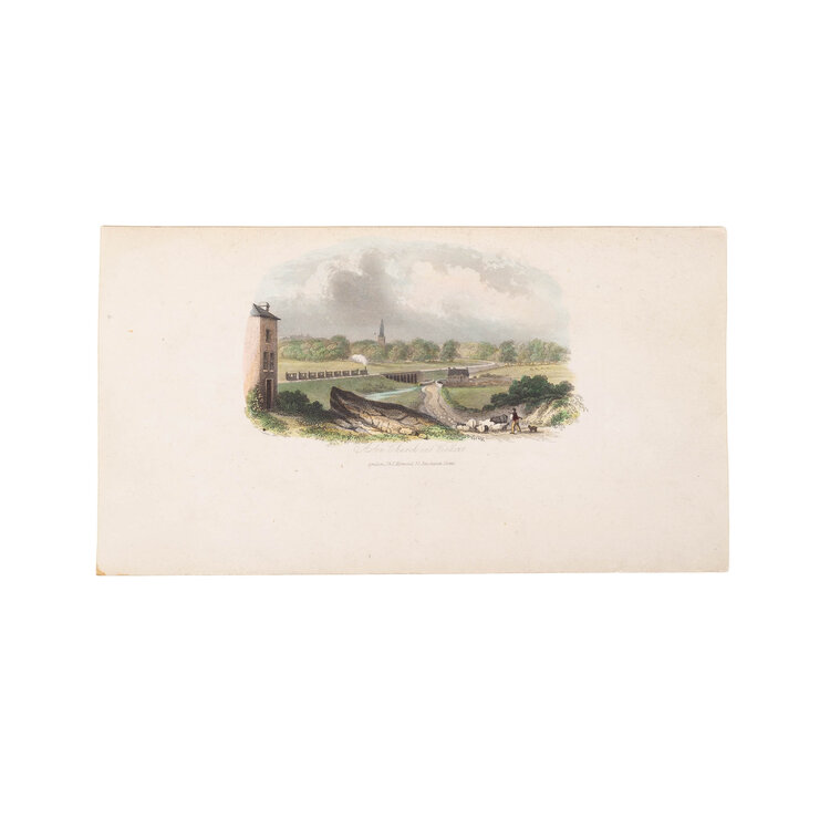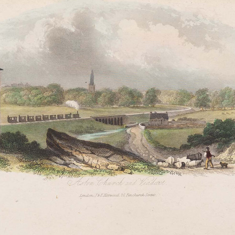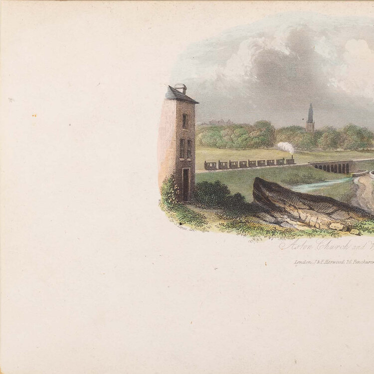 Twee prenten van Birmingham, Groot-Brittannië: 'Station Grand Junction Railway, Vauxhall, Birmingham'. Ets en gravure door Henry Harris, uitgever J. & F. Harwood. Zicht op station Vauxhall dat dienst deed als tijdelijk eindstation van de Grand Junction Railway in Birmingham in 1837. Datering: circa 1841; 'Aston Church and Viaduct'. Ets en gravure door S. Lines, uitgever J. & F. Harwood. Zicht op het spoorwegviaduct Aston Viaduct en in de verte de Aston Church, Birmingham. Datering: circa 1860. Conditie: De prenten hebben sporen van ouderdom. Verkleuring, vlekken en kleine beschadigingen aan de randen. Afmetingen van papier prent: ca. 14,5 x 25,5 cm.