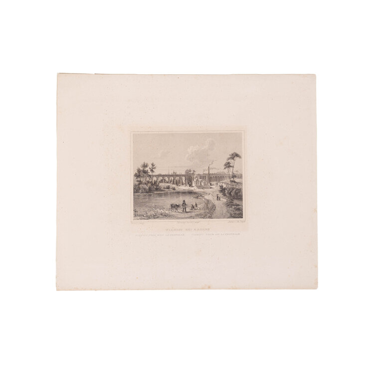 Twee prenten van Duitsland: 'Viaduct bei Aachen. Viaduct pres d'Aix la Chapelle/ Viaduct near Aix la Chapelle'. Staalgravure van Joh. Poppel naar een ontwerp van L. Lange, uitgegeven door G.G. Lange in Darmstadt. Viaduct met de spoorlijn en uitzicht op Burtscheid. Datering: circa 1840; Sächs Schweiz. 'Schandau'. Litho van J. Redel, druk van J. Braunsdorf, uitgegeven door E. Müller in Dresden. Zicht op de Saksisch-Boheemse Spoorweg, Sächsisch-Böhmische Staatseisenbahn. Datering: circa 1850. Conditie: De prenten hebben sporen van ouderdom. Verkleuring, veel vlekken en kleine beschadigingen aan de randen. Afmetingen van papier prenten: ca. 12 x 16 cm; ca. 20 x 24 cm.