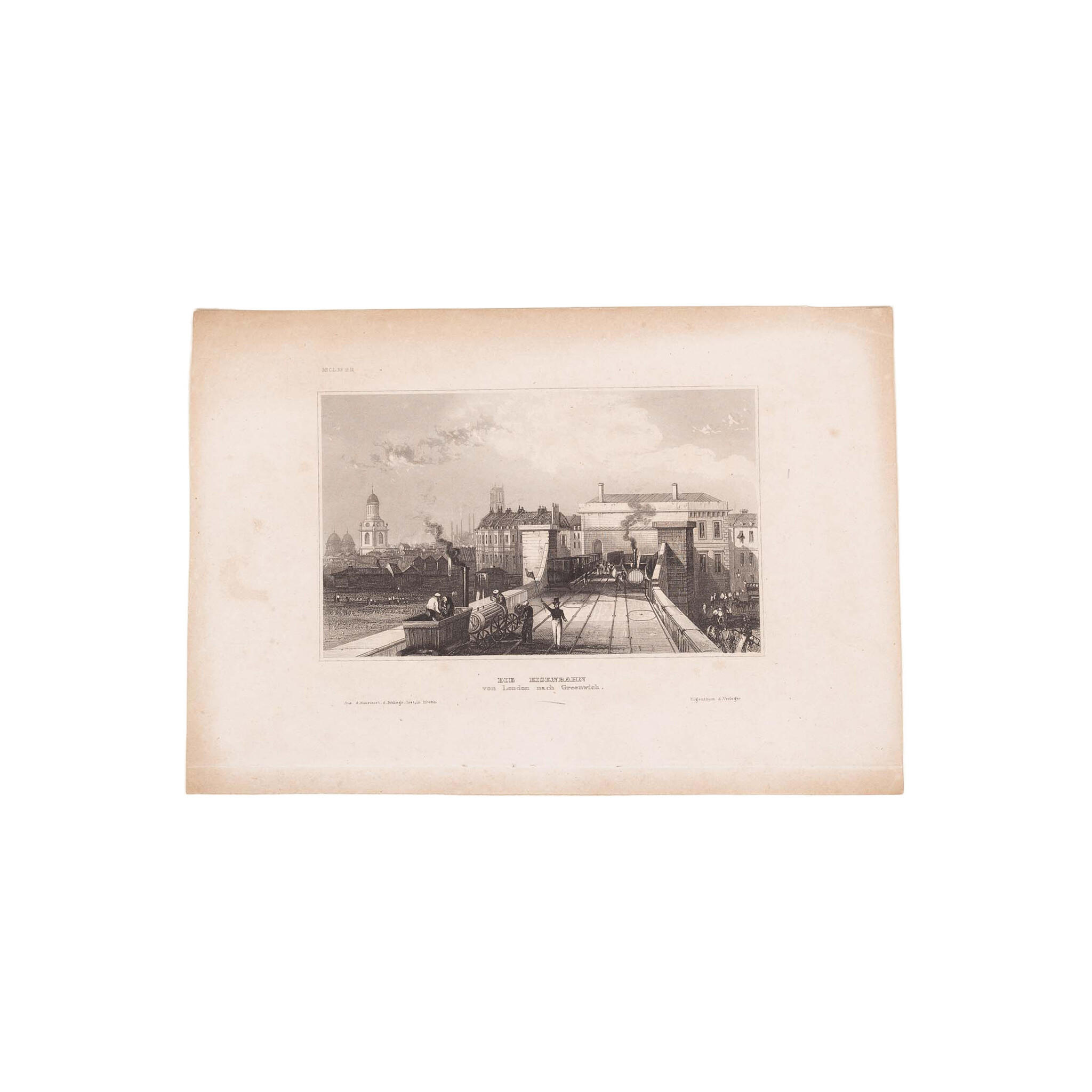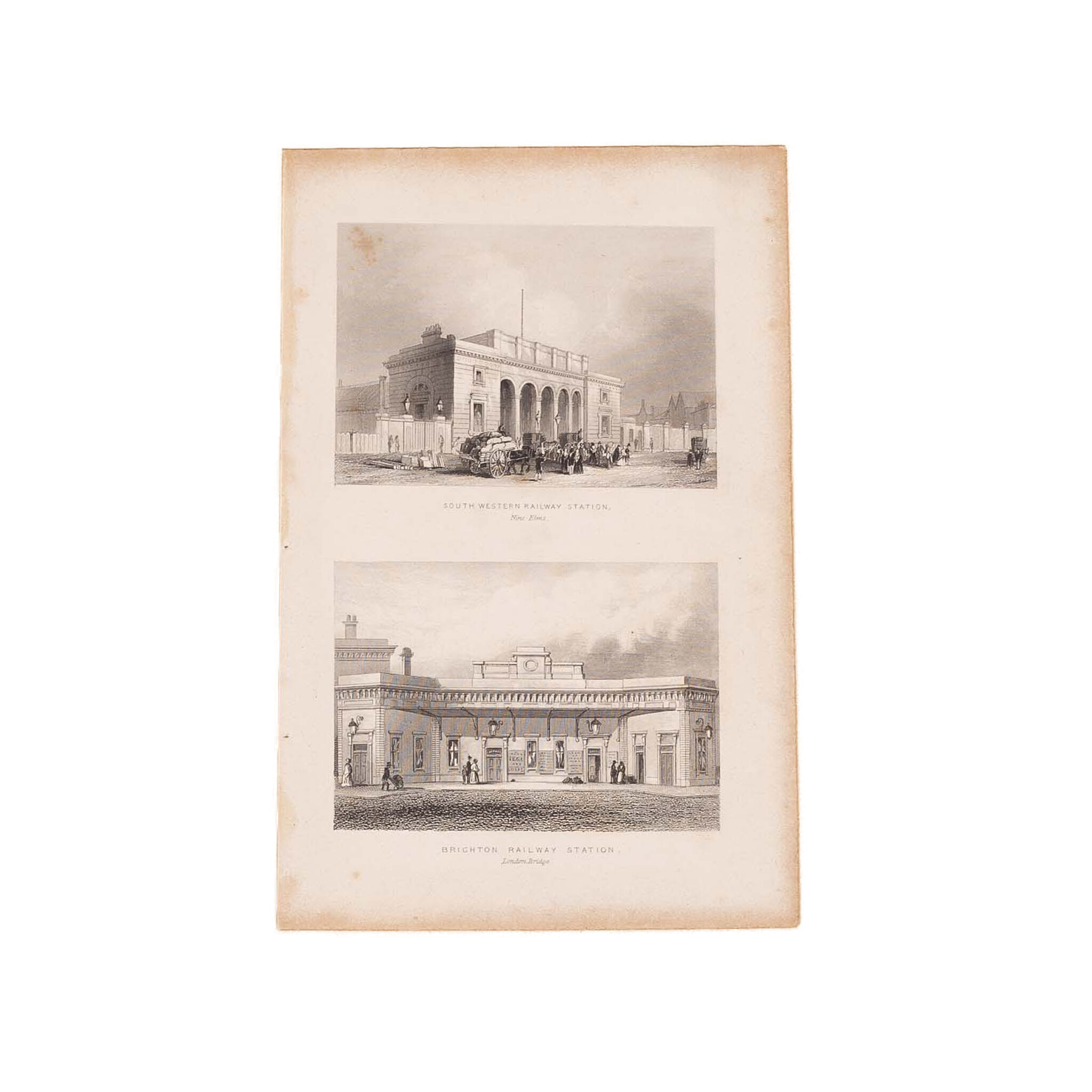 Twee prenten van Groot-Brittannië: 'Die Eisenbahn von London nach Greenwich', Bibliographisches Institut, Hildburghausen. Gravure en ets van het gezicht op de spoorweg van Londen naar Greenwich, met Greenwich op de achtergrond. Datering: ca. 1840; 'South Western Railway Station', Nine Elms. 'Brighton Railway Station', London Bridge. Ets en gravure van twee treinstations. Datering: ca. 1845. Conditie: De prenten hebben sporen van ouderdom. Verkleuring, vlekken en kleine beschadigingen aan de randen. Afmetingen van papier prenten: ca. 17 x 24,5 cm; ca. 18 x 11,5 cm.