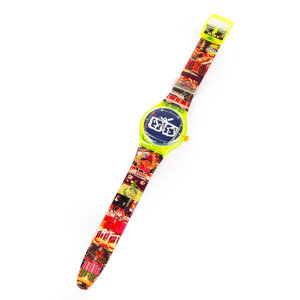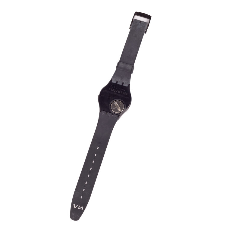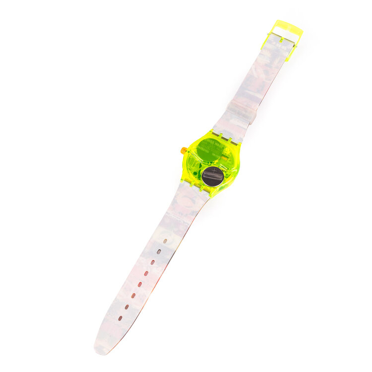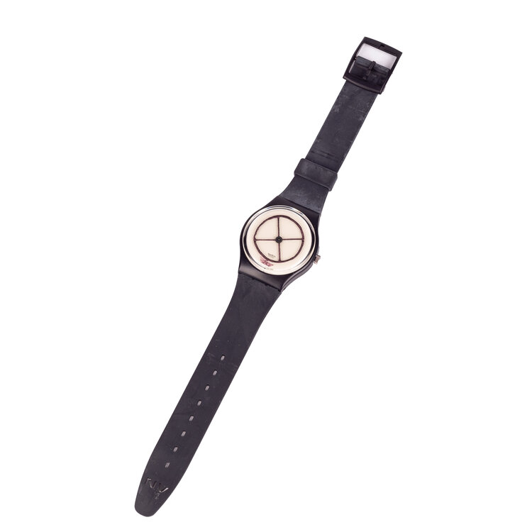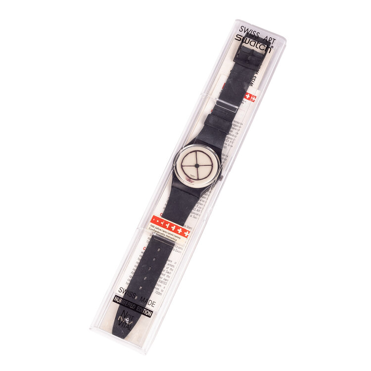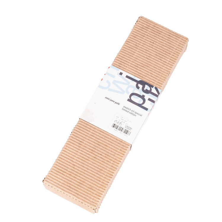 Swatch, SLZ 104 'Nam June Paik' 1996, GZ 120 'Wheel Animal', 1991. Nam June Paiks horloge uit de MusiCall lijn van Swatch heeft oplage nummer 05435/30000. Swatch werd in 1983 opgericht en onderscheidt zich als Zwitsers horlogemerk met zijn slimme techniek en bijzondere ontwerpen, die in beperkte oplage werden uitgevoerd. Vanwege de grote hoeveelheid verschillende designs en samenwerkingen werden de Swatch horloges collectors items die nog steeds wereldwijd worden verzameld. Conditie: De horloges zijn in zeer goede staat en in originele verpakking. Afmetingen: 'Nam June Paik' 25 x7x 3 cm. 'Wheel animal' 24 x 4 x 2 cm