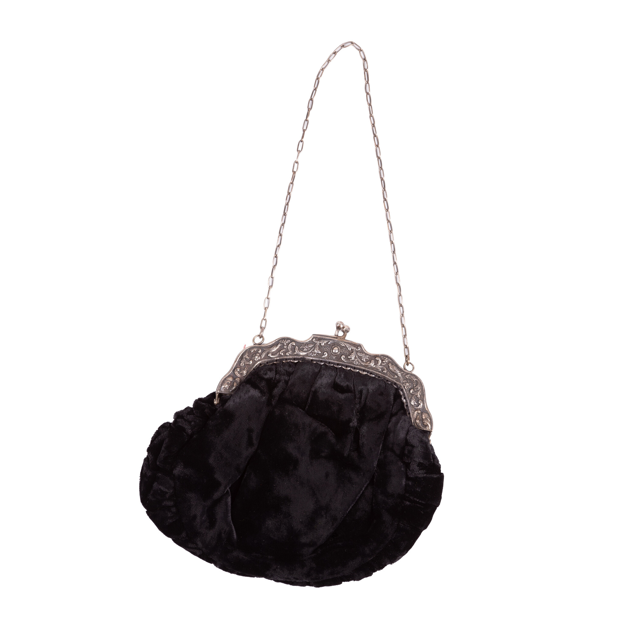Twee tasjes, 19e/20ste eeuw. Het zwarte fluwelen avondtasje heeft een decoratieve metalen sluiting, draagketting en binnenvoering; Het antieke maliënkoldertasje van alpaca, gemaakt van in elkaar gehaakte ringetjes, heeft een decoratieve beugel, draagketti