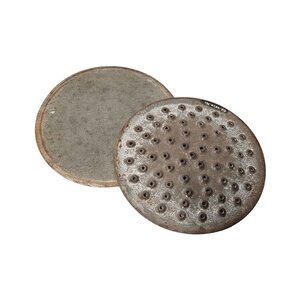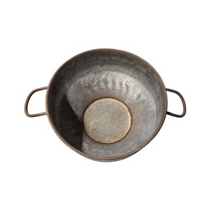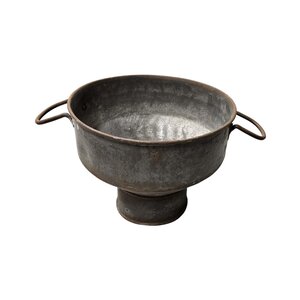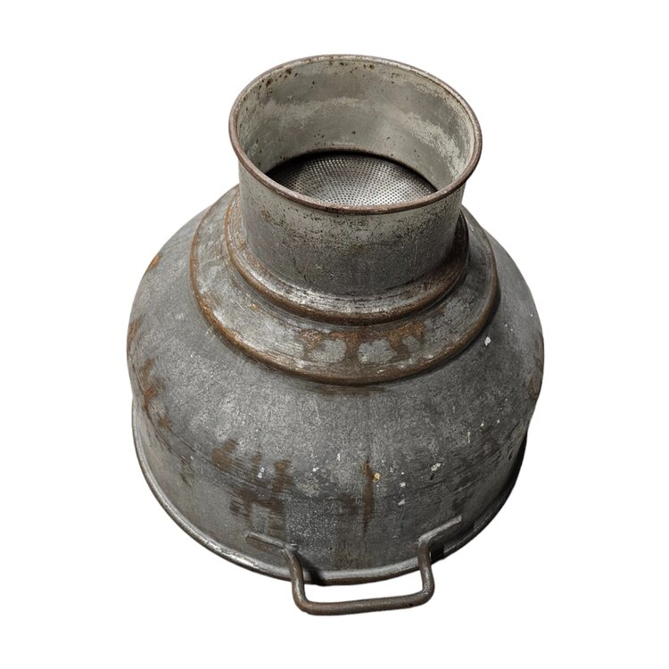 Melkzeef of teems. Convex trechtervormige bak met cilindrische voet van metaal. Aan de zijkanten zitten 2 oren die aan de bak gelast zijn. De grootte van de bijbehorende zeven verschilt, evenals de grootte van de gaten. Datering: 1850-1949. Conditie: gebruikt, oxidatievlekken. Afmetingen: ca. 31,4 x 46,0 x 23,3 en ca. 26,1x 45,3 x 18,6 cm.