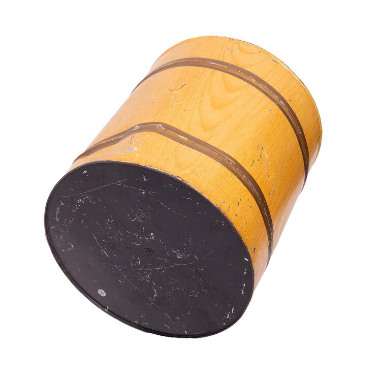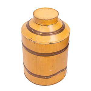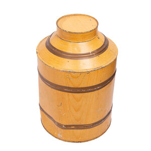 Uitlotingsbus van onbekende maatschappij. Sommige bedrijven gaven obligatieleningen uit. Met behulp van een uitlotingsbus werd door loting bepaald welke stuknummers van leningen op een vooraf bepaald tijdstip (deels) werden afgelost. Het blik is geel geverfd met gouden lijnen. Datering: eerste helft 20ste eeuw. Conditie: gebruikt, een deuk aan de zijkant. Afmetingen: ca. 35 x ø 25,5 cm.