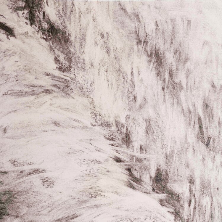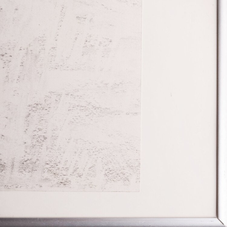 Ursula Neubauer (München, 1939), 'Lichtveld', 1990. Houtskool op papier in metalen lijst met plexiglas. Landschap met bovenin een lichte baan. Signatuur linksonder. Conditie: goed, enkel hier en daar lichte gebruikssporen aan de lijst. Afmetingen lijst: 77 x 98 cm; beeldvlak 70 x 85 cm.