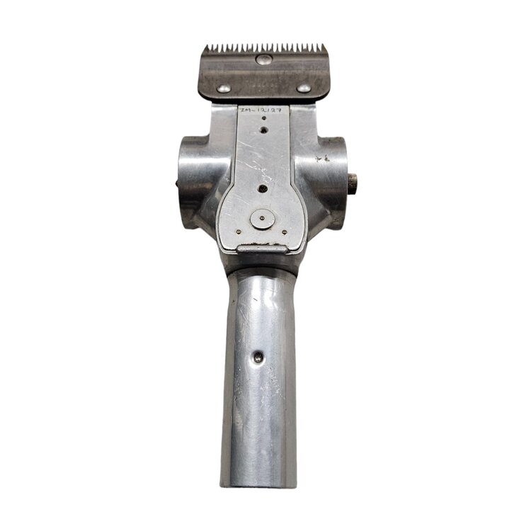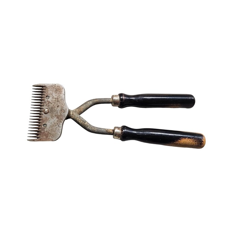 Schapenschaar van staal, handschaar voor het scheren van schapen. De schaar heeft geen aparte veer, hij opent door de elasticiteit van het staal. Datering: 1900. Conditie: redelijk, oxidatieplekken. Afmetingen: ca. 30,0 x 8,0 cm. Koeientondeuse, van staal, voor het scheren van koeien, met handkracht bediend. De tondeuse is voorzien van zwart geschilderde handvatten van hout. Datering: 1900-1900. Conditie: goed. Afmetingen: ca. 25,0 x 8,0 cm. Pneumatische koeientondeuse, voor het scheren van koeien. Aan te drijven met behulp van vacuum van de melkmachine via een turbine. Verwisselbare messen van staal. Op de messenhouder een plaatje van aluminium met de merknaam 'Alfa-Laval'. Datering: 1900-1900. Conditie: goed, werking niet getest. Afmetingen: ca. 30,0 x 8,0.