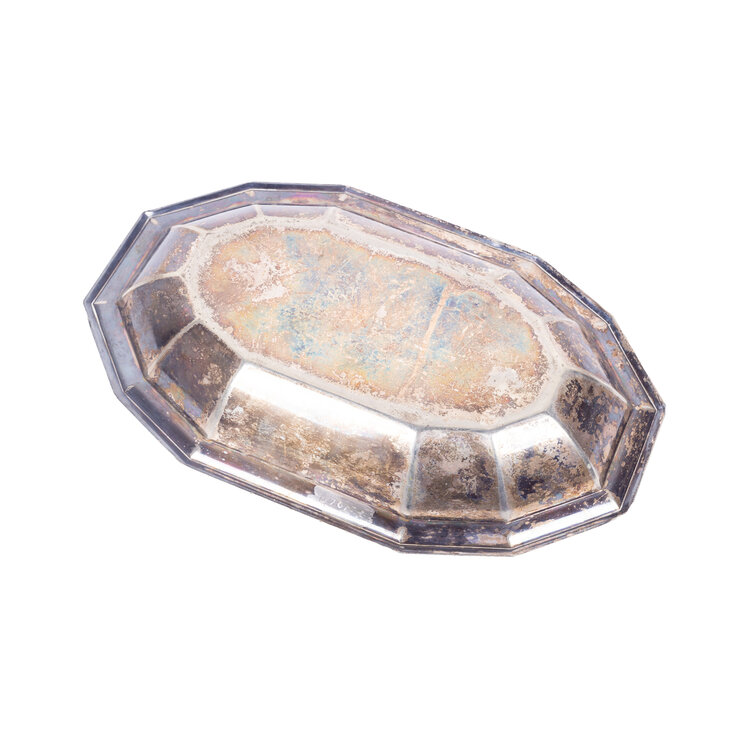 Verzilverde schaal, datering onbekend. Hoekige schaal van verzilverd metaal. Conditie: de zilverlaag is aangetast door slijtage en oxidatie. Afmetingen: 3.5 x 20.2 x 33 cm.