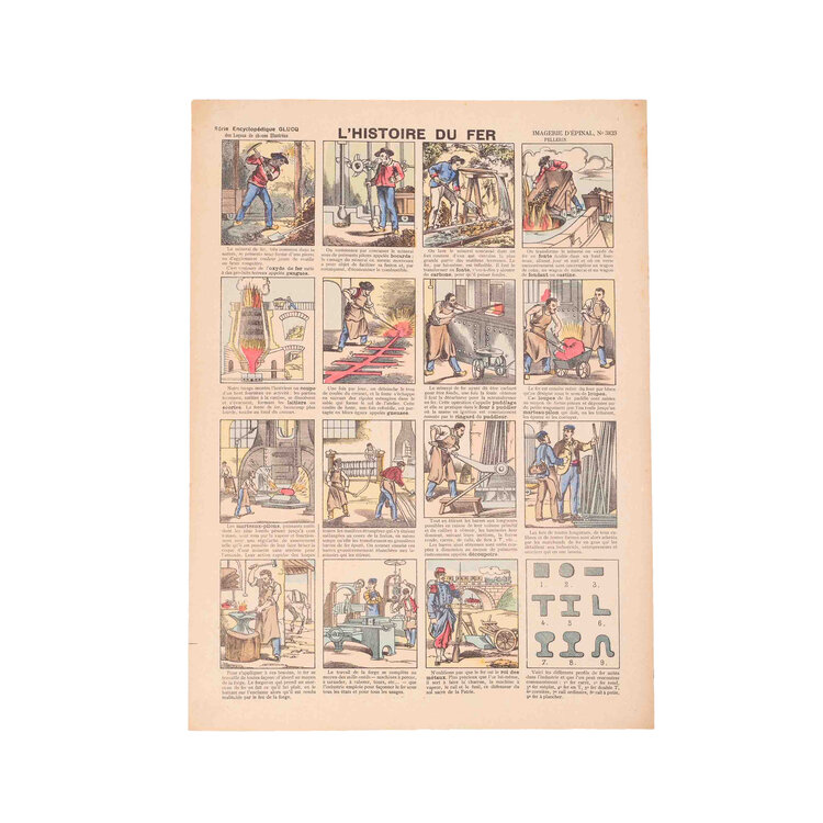 Vier centsprenten van Pellerin: 'l'Histoire du fer'. Imagerie d'Épinal,N°3823; 'La science a la portée de la main'. Imagerie d'Épinal N° 3812; 'La science a la portée de la main'. Imagerie d'Épinal N° 3813; 'Le travail de chacun est utile a tous'. Imagerie d'Épinal N° 3805. Uit de 'Série Encyclopédique Glucq des Leçons de choses Illustrées'. Deze encyclopedische serie bestaat uit geïllustreerde lessen en is het resultaat van de samenwerking tussen een Parijse reclameontwerper en de beeldstudio Pellerin in Épinal rond de eeuwwisseling van de 20e eeuw. Het doel van de serie, die bestond uit 'lessen in dingen', was om de toekomstige burger vorm te geven. Datering: circa 1900. Conditie: De prenten hebben sporen van ouderdom. Verkleuring, vlekken en kleine beschadigingen aan de randen. Afmetingen van papier prenten: circa 40 x 29,5 cm.