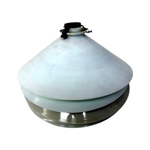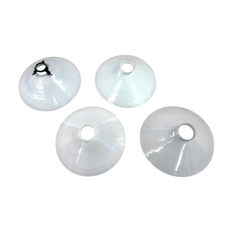 Vier antieke glazen lampenkapjes uit 1920 van melkglas. Conditie: goed, vertonen gebruikssporen. Afmetingen: diameter 26 cm, hoogte 9 cm.