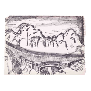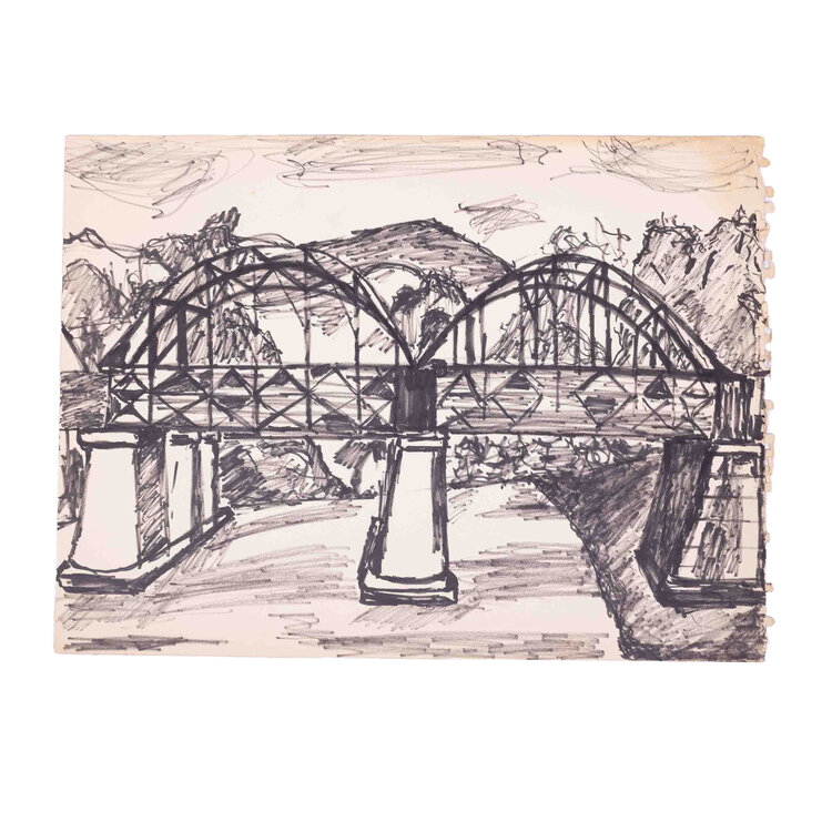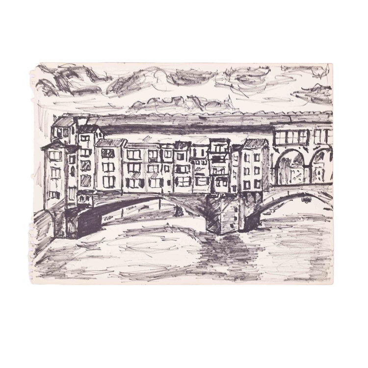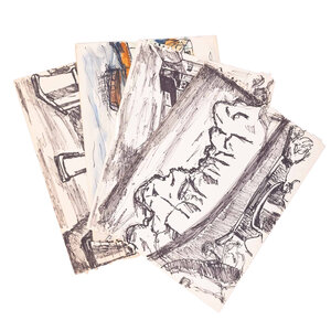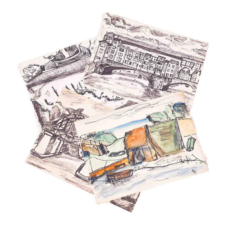 Vier schetsen van landschappen in stift op schetsboek papier. Landschap met bootje met aquarel ingekleurd, mogelijk getekend door Victor Swagemakers. Schets van brug met huizen, Ponte Vecchio in Florence. De twee andere landschapstekeningen zijn vermoedelijk ook in Italië gemaakt. Conditie: De tekeningen zijn in prima conditie maar tonen sporen van ouderdom en gebruik. Afmetingen: 27 x 37 cm.