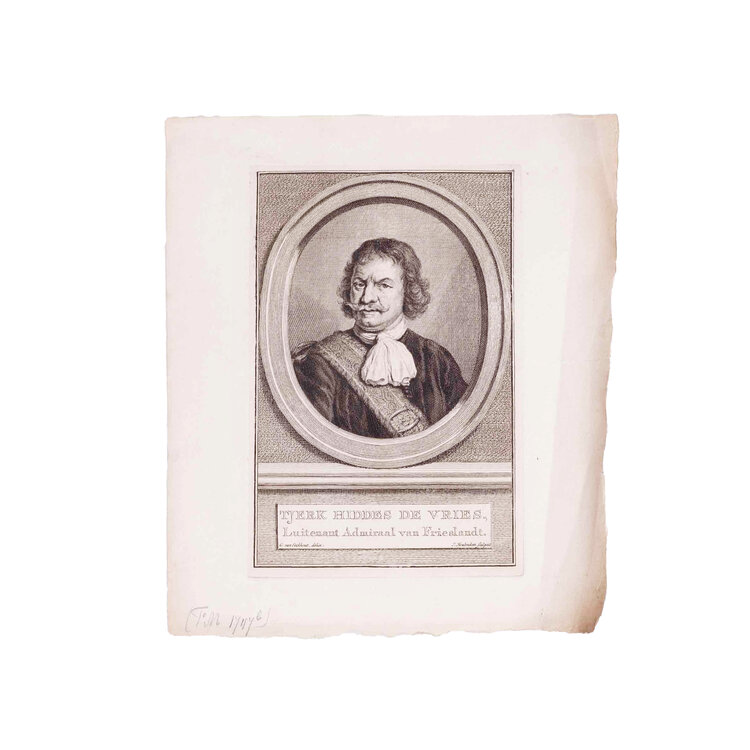 Prent 'Egbert Meeuwszoon Kortenaar', (Groningen, ca. 1604 - Lowestoft, Engeland, 13 juni 1665) Luitenant-Admiraal van Holland en Westfriesland; Prent 'Cornelis Evertsen' (Vlissingen, 16 april 1628 - Vlissingen, 20 september 1679), Vice-Admiraal van Zeeland; Prent 'Adriaan Bankert' (vermoedelijk Vlissingen, ca. 1615-1620 - 22 april 1684), Luitenant Admiraal van Zeeland; Prent 'Tjerk Hiddes de Vries' (Sexbierum, 6 augustus 1622 - Vlissingen, 6 augustus 1666), Luitenant Admiraal van Frieslandt. Gravures van Jacob Houbraken. De prenten zijn zwart-wit. Datering: ca. 1749-1760. Conditie: De prenten vertonen sporen van ouderdom. Verkleuring, vlekken en kleine beschadigingen aan de randen. Afmetingen beeldvlak prenten: ca. 17 x 10 cm.