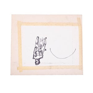 Vier schetsen van sculpturen op met viltstift waarvan één in passepartout