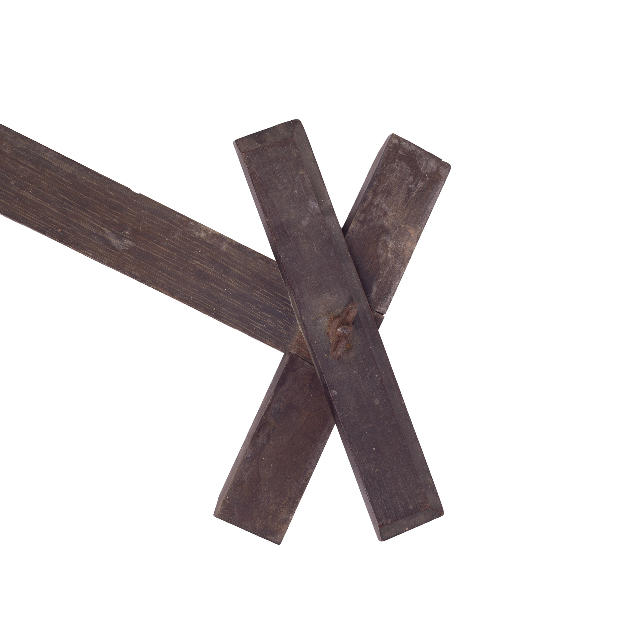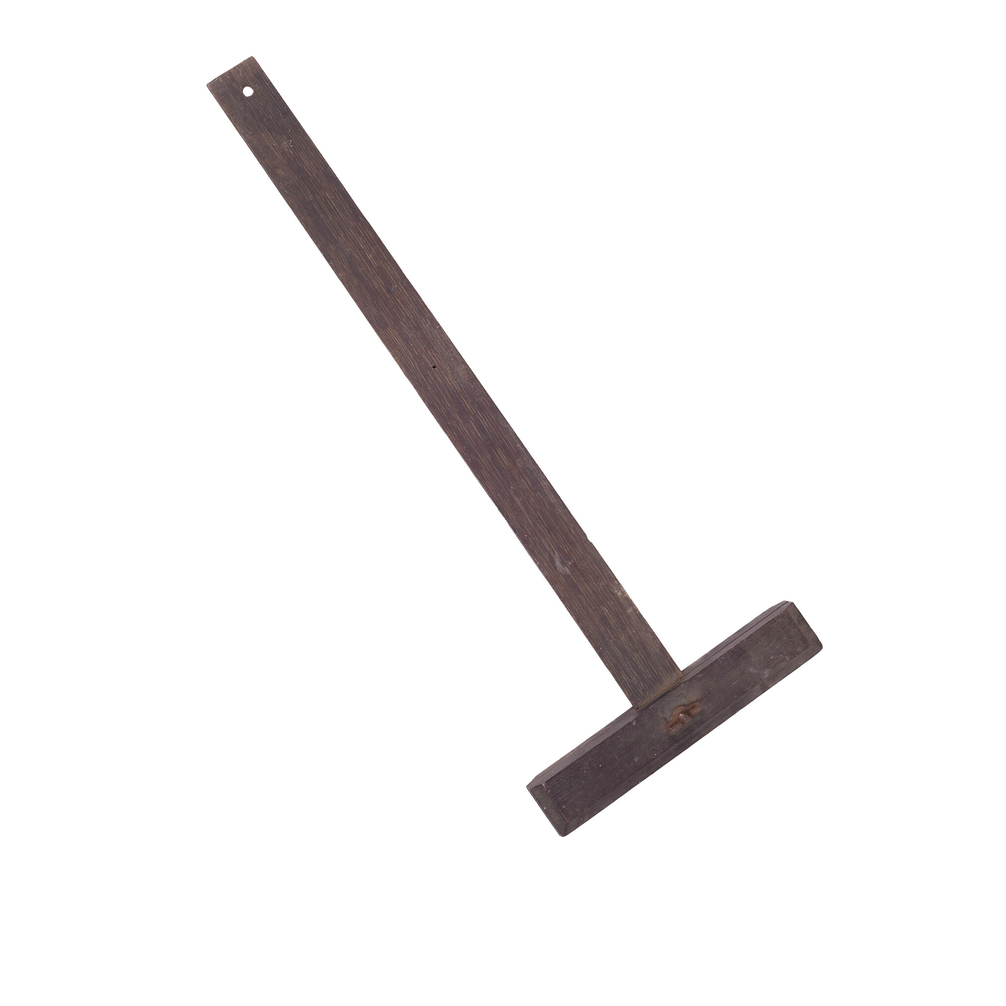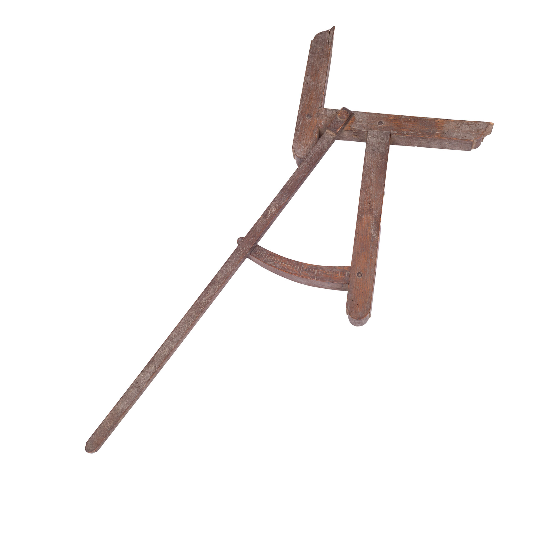 Vier stuks oud Hollands gereedschap met oa. een hoekmeetinstrument en een tekenhaak. Op het hoekmeetinstrument zitten streepjes/graden en een lat die de hoek kan aangeven. Antieke tekenhaken werden gebruikt op technische tekentafels om horizontale en verticale lijnen te trekken. Datering: 19e en 20ste eeuw. Conditie: gebruikssporen, oxidatie en houtwormgaatjes. Afmetingen: ca. 48 x 20 x 3 cm / 80 x 20 x 20 cm.