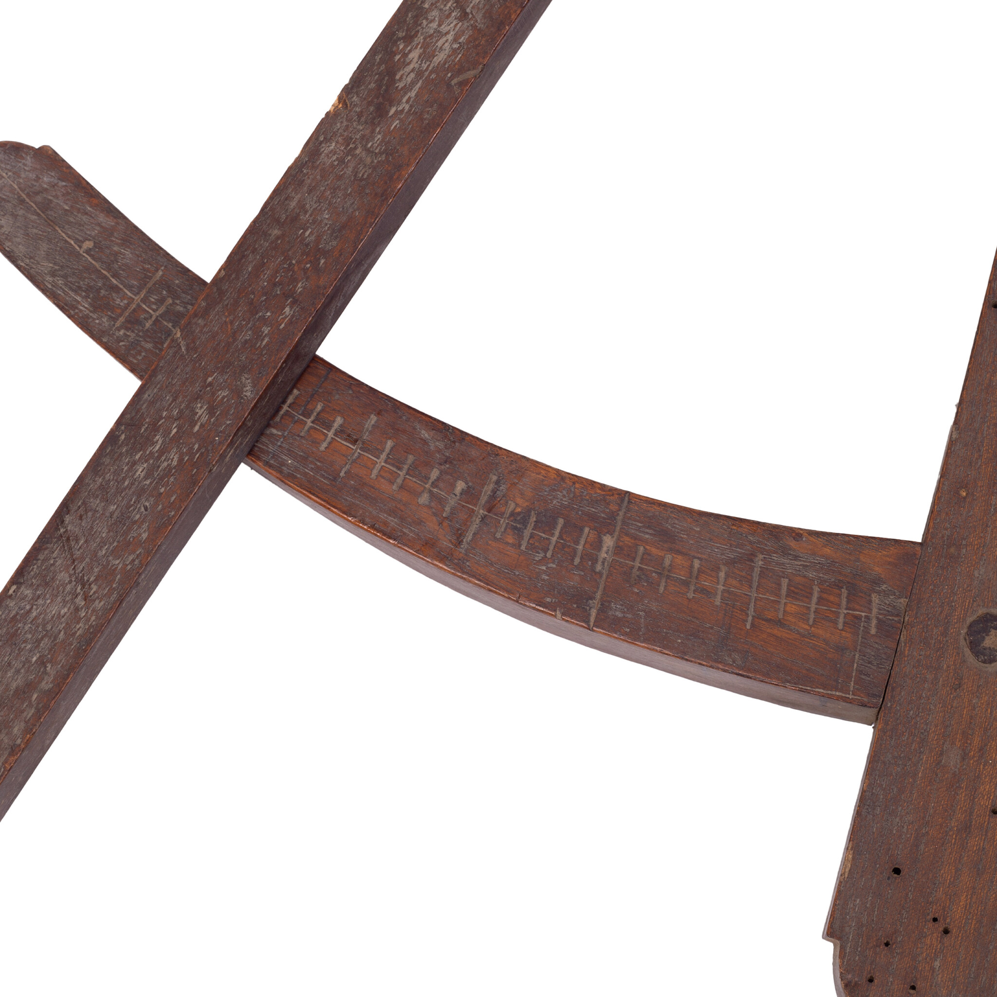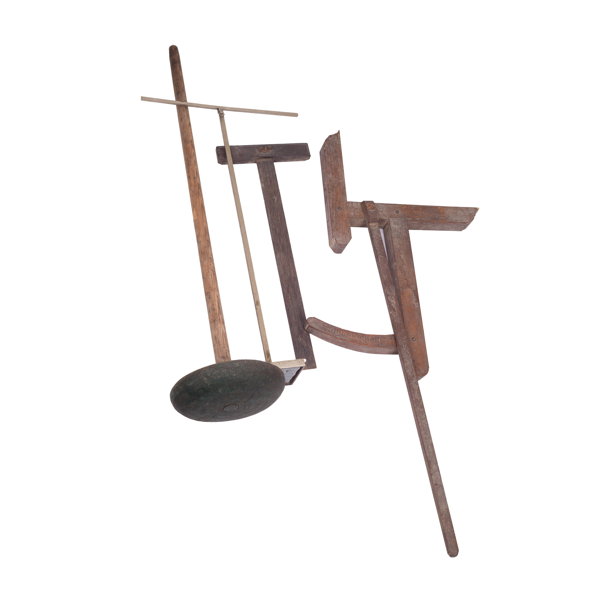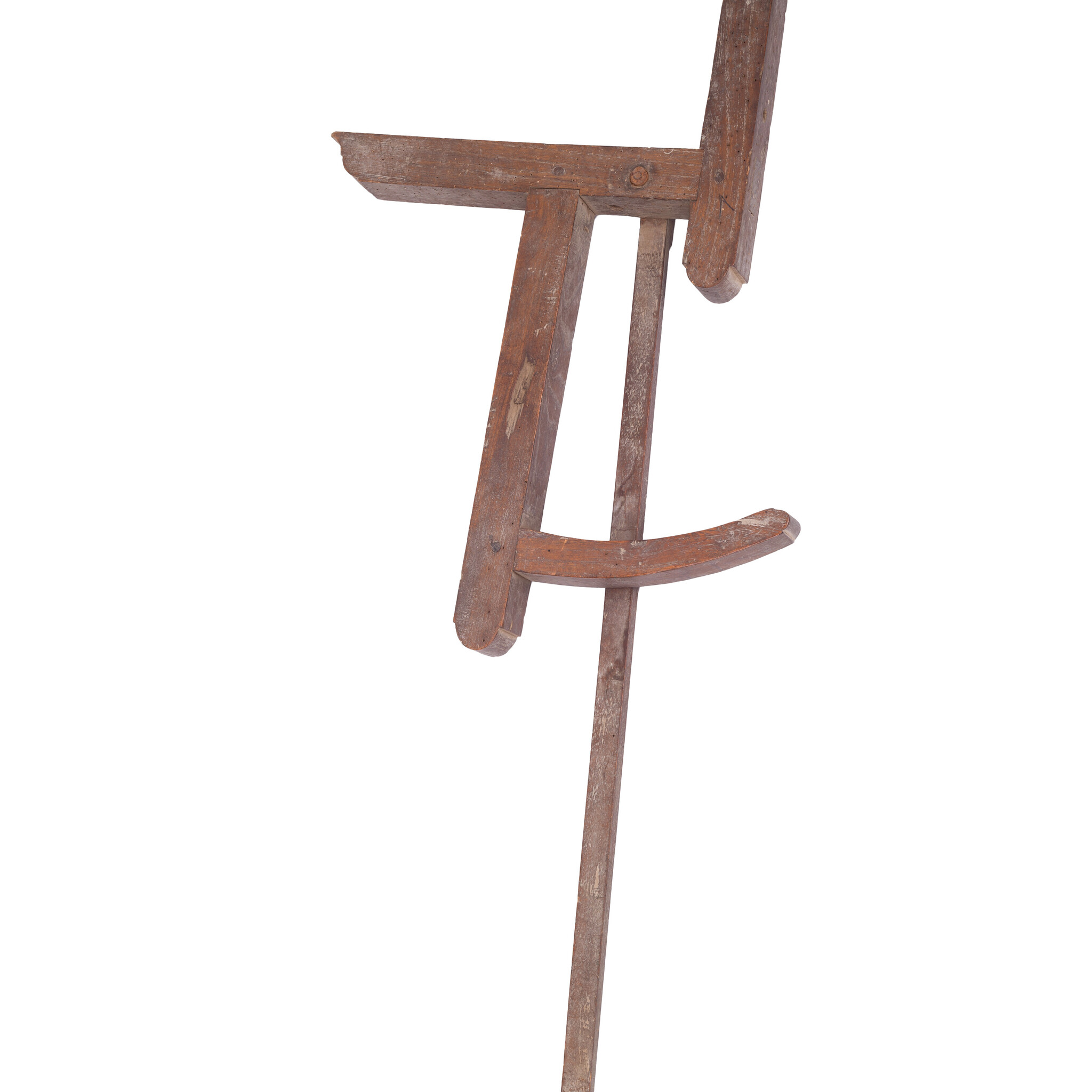 Vier stuks oud Hollands gereedschap met oa. een hoekmeetinstrument en een tekenhaak. Op het hoekmeetinstrument zitten streepjes/graden en een lat die de hoek kan aangeven. Antieke tekenhaken werden gebruikt op technische tekentafels om horizontale en verticale lijnen te trekken. Datering: 19e en 20ste eeuw. Conditie: gebruikssporen, oxidatie en houtwormgaatjes. Afmetingen: ca. 48 x 20 x 3 cm / 80 x 20 x 20 cm.