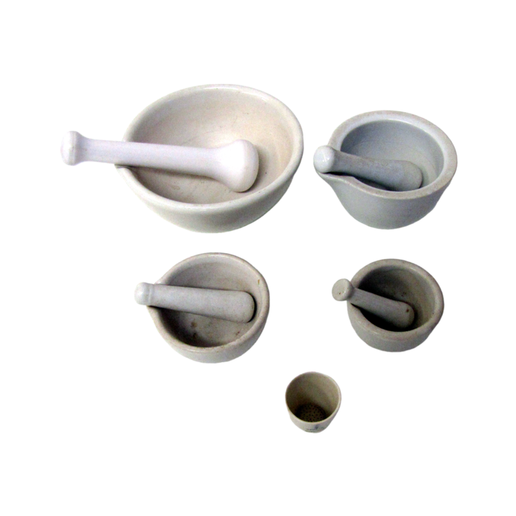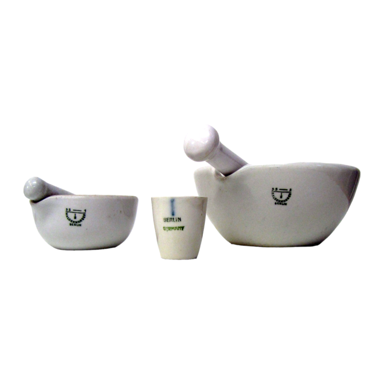 Set van vier porselijnen vijzels met stampers van verschillende maten plus een medicijnbekertje van het merk Kaldenwanger Berlijn. Datering van voor 1970. Afmetingen: de maten van de vijzels zijn in diameter resp. 15 cm, 10 cm, 8,5 cm 7 cm. De hoogtes zijn resp. 6,5 cm, 6 cm, 4 cm, 4 cm. Het bekertje is 3.5 cm hoog. Conditie goed.