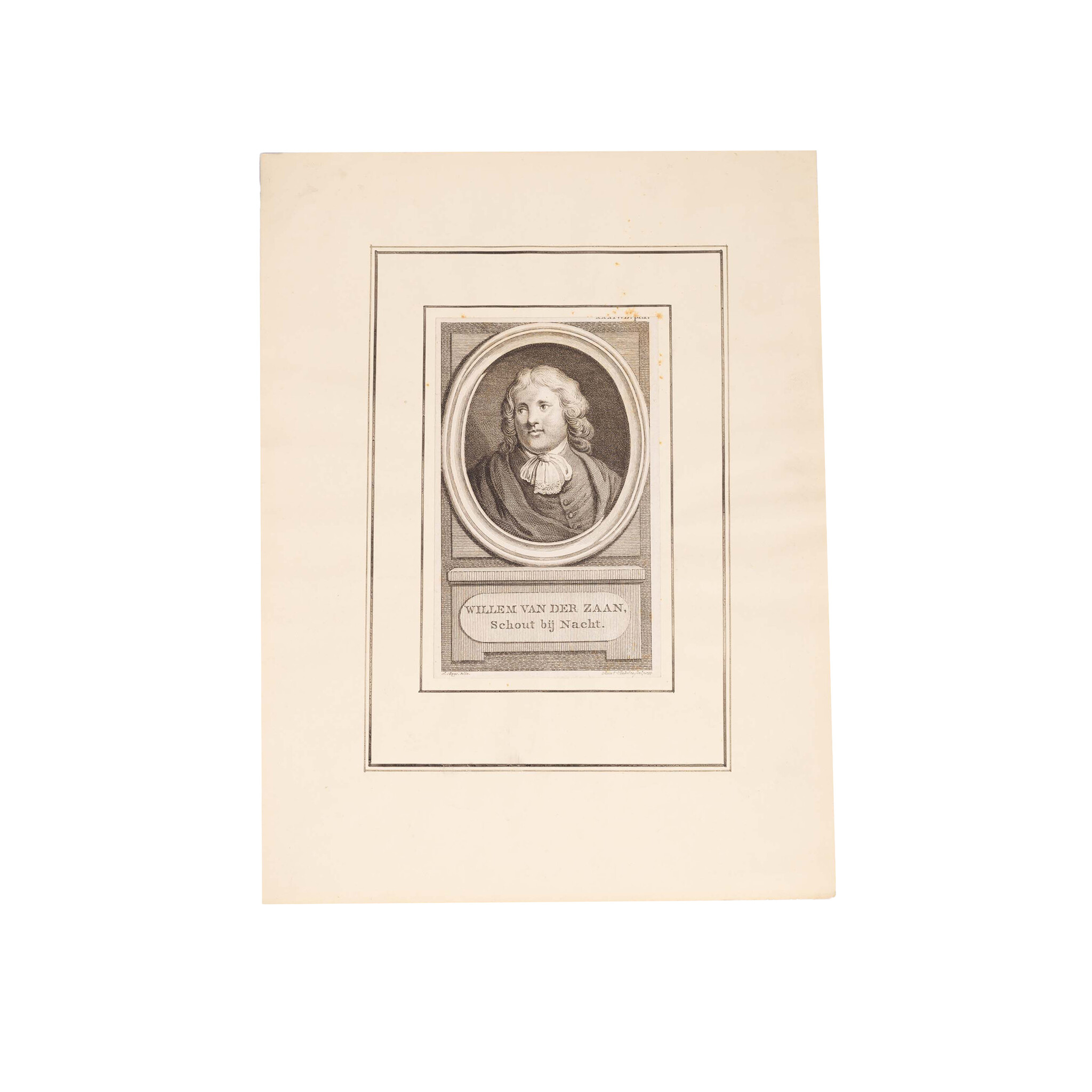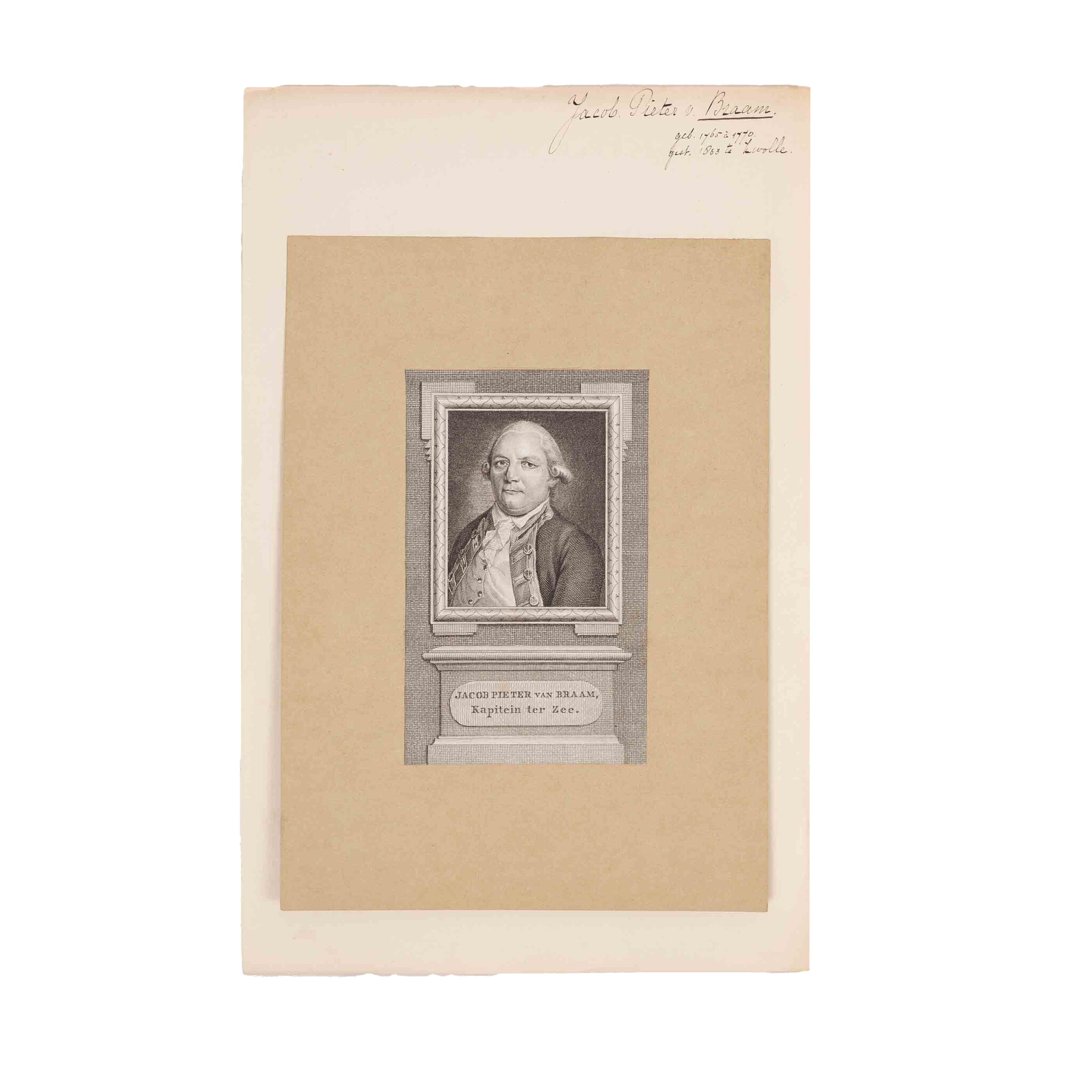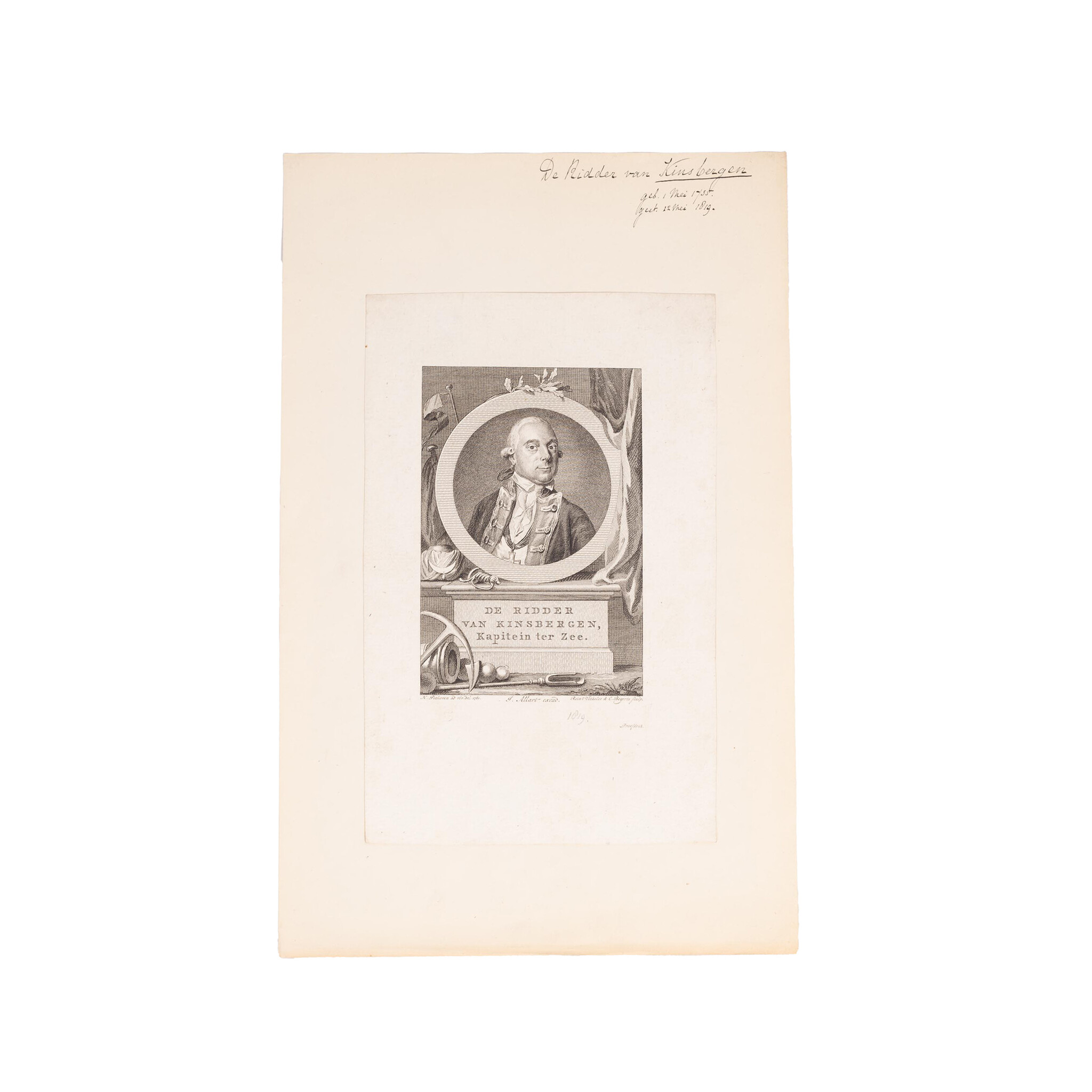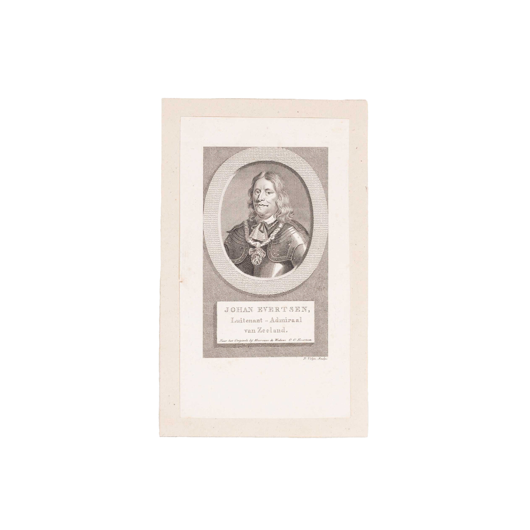 Prent 'Jan van Brakel' (Rotterdam, ca. 1618 - 10 juli 1690), Schout bij Nacht van Holland en Westfriesland; Prent 'Willem van der Zaan' (Amsterdam, 29 juni 1621 - voor de kust van Marokko, 17 maart 1669), Schout bij Nacht; Prent 'Jan Hendrik van Kinsbergen' (Doesburg, 1 mei 1735 - Apeldoorn, 24 mei 1819), De ridder van Kinsbergen, Kapitein ter Zee; Prent 'Jacob Pieter van Braam' (Werkhoven, 27 oktober 1737 - Zwolle, 16 juli 1803), Kapitein ter Zee; Prent 'Johan Evertsen' (Vlissingen, 1 februari 1600 - Noordzee/ Walcheren, 5 augustus 1666), Luitenant-Admiraal van Zeeland. Gravures van Reinier Vinkeles. De prenten zijn zwart-wit. Datering: ca. 1760-1785. Conditie: De prenten vertonen sporen van ouderdom. Verkleuring, vlekken en kleine beschadigingen aan de randen. De prenten zijn geplakt op een vel. Afmetingen beeldvlak prenten: ca. 15 x 9 cm.