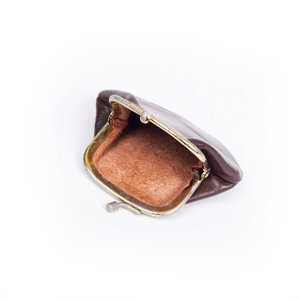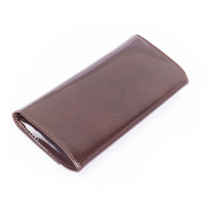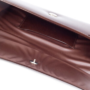 Vintage bruine kunststof cluth met portemonnee van imitatieleer. De clutch heeft een druksluiting en aan de binnenzijde zit een vakje met een dubbelzijdige spiegel erin. Datering: onbekend. Conditie: de clutch is in nieuw-staat; het beursje toont gebruikssporen, met name aan de sluiting, maar verder nog in mooie staat. Afmetingen clutch: 12 x 24 cm x 4 cm; portemonnee: 9 x 9 x 2 cm.