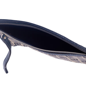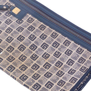 Vintage clutch van Guy Laroche in beige textiel, bedrukt met logo's in zwart. De clutch heeft een ritssluiting, een donkerblauw leren polsbandje en is afgezet met donkerblauw leren biezen. Datering onbekend. Conditie: vertoont gebruikssporen. Afmetingen: 18 x 29,5 x 5 cm.