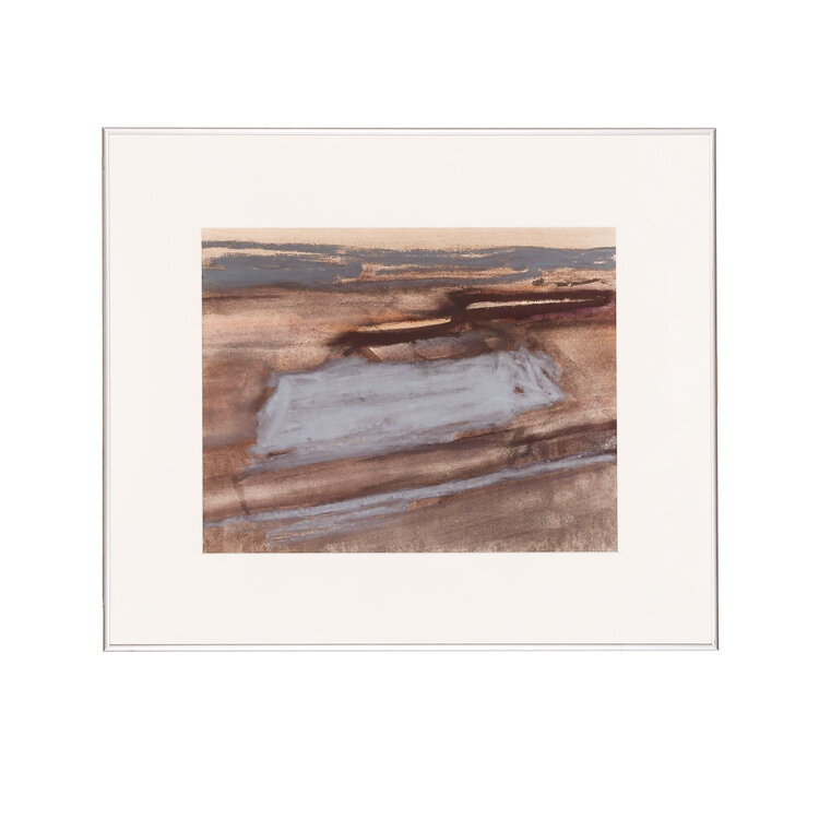 W. Roos, landschap 6, jaartal onbekend. Gemengde techniek op papier in metalen lijst. Abstracte compositie in blauw, zwart en grijs. Conditie: goed, gebruikssporen aan lijst. Afmeting werk zonder lijst: 34 x 42 cm.
