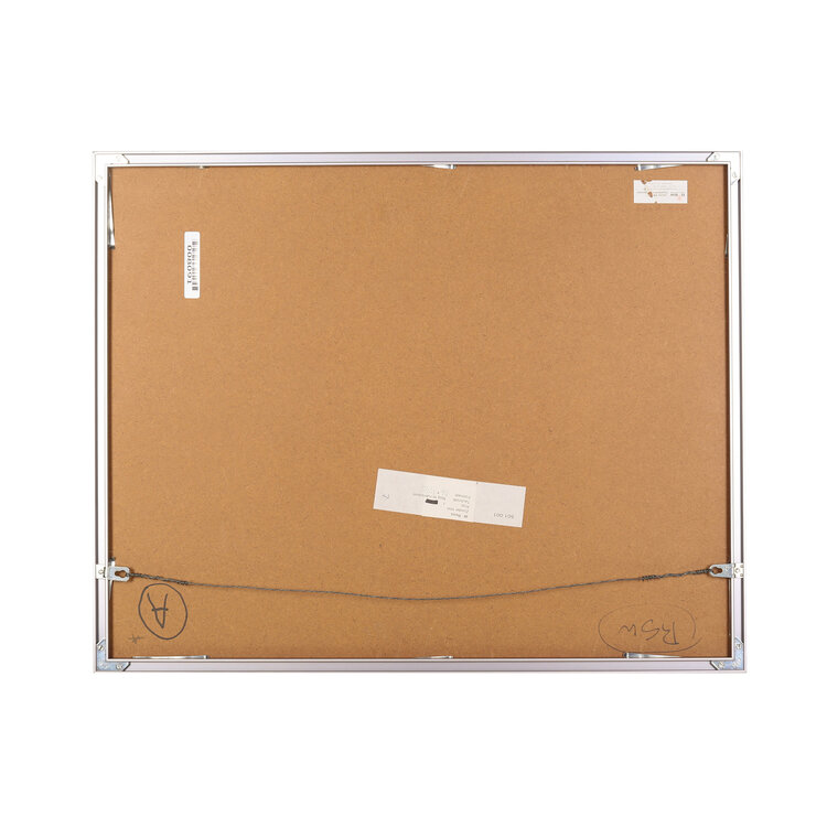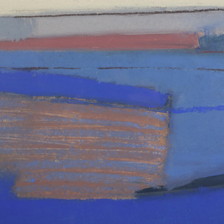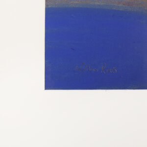 W. Roos, landschap 6, jaartal onbekend. Gemengde techniek op papier. Abstracte compositie in blauw, wit en roze met zwarte lijnen. Conditie: goed, gebruikssporen aan lijst. Afmeting werk zonder lijst: 34 x 47 cm.