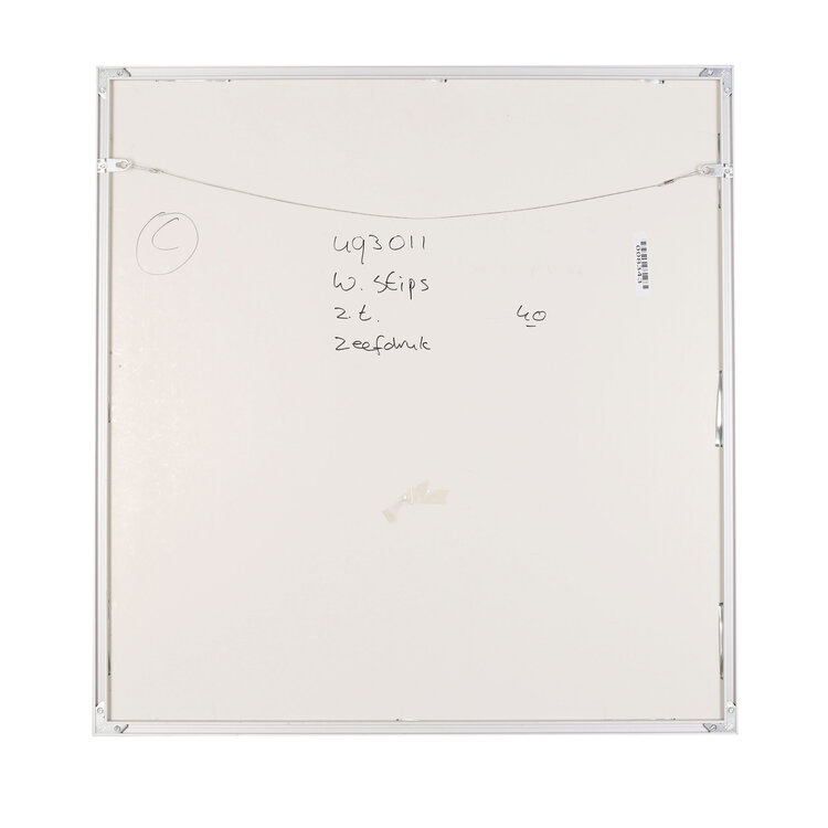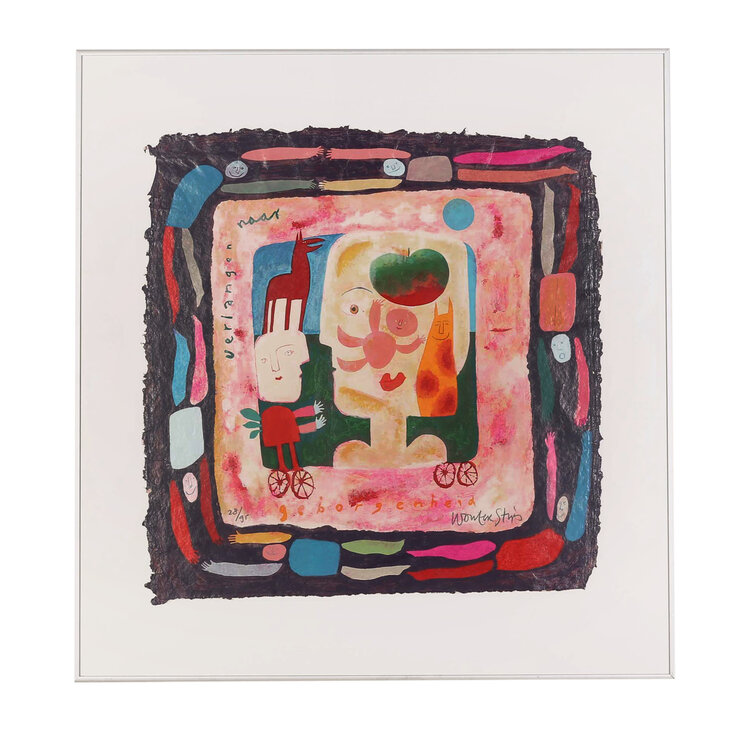 W. Stips, zonder titel, jaartal onbekend. Zeefdruk, oplage 28/95 Kleurrijke voorstelling met menselijke figuren en dieren. Afmetingen: Beeldvlak 50 x 50 cm. Conditie: Lijst toont sporen van gebruik.
