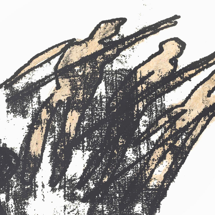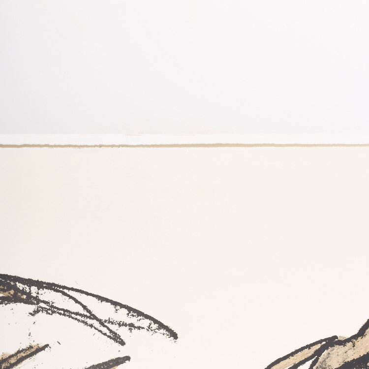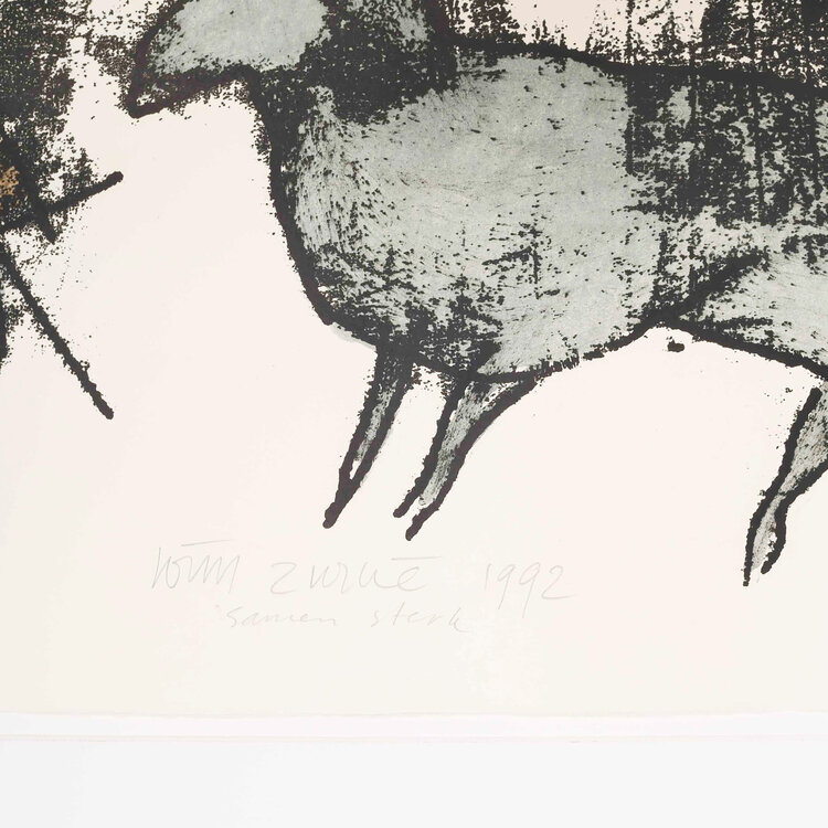 Wim Zurne, Samen sterk, 1992. Carborundumdruk op papier in metalen lijst. Abstracte afbeelding van een grijs dier met daarachter drie bruine figuren. Onderaan signatuur, jaar en titel. Conditie: gebruikssporen aan lijst. Afmeting lijst: 90 x 120 cm.