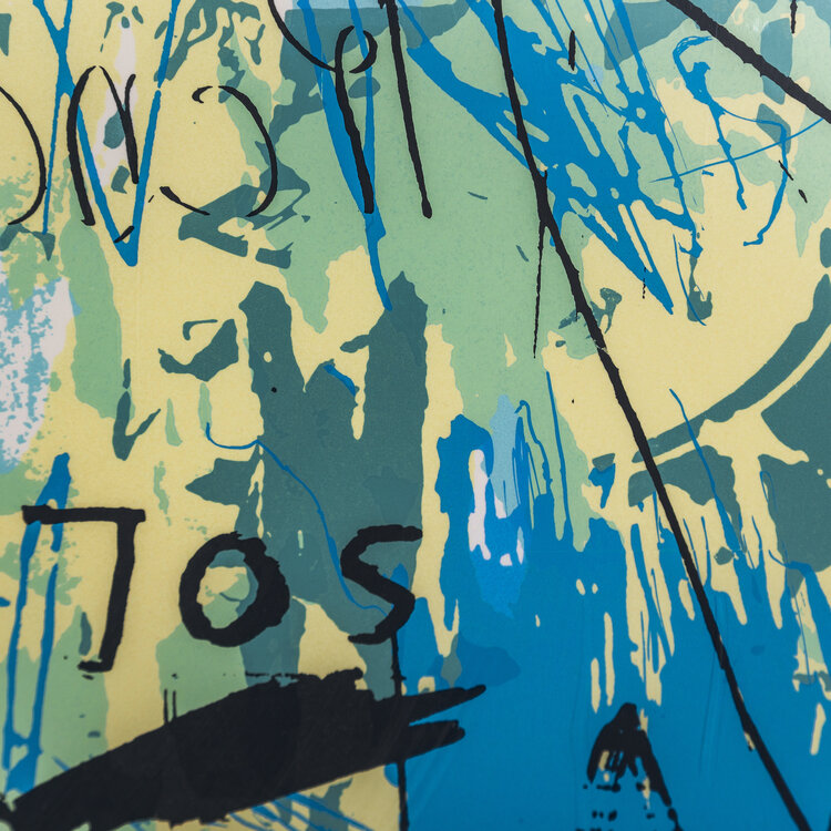 W.A. Kunnen, Taal en teken, 1990. Zeefdruk op papier in metalen lijst, oplage 1/15. Abstracte voorstelling in blauwtinten met in zwart letters, teksten en lijnen. Linksonder titel en oplagenummer, rechtsonder signatuur en jaartal. Conditie: goed, gebruikssporen aan lijst. Afmeting werk zonder lijst: 54 x 80 cm.