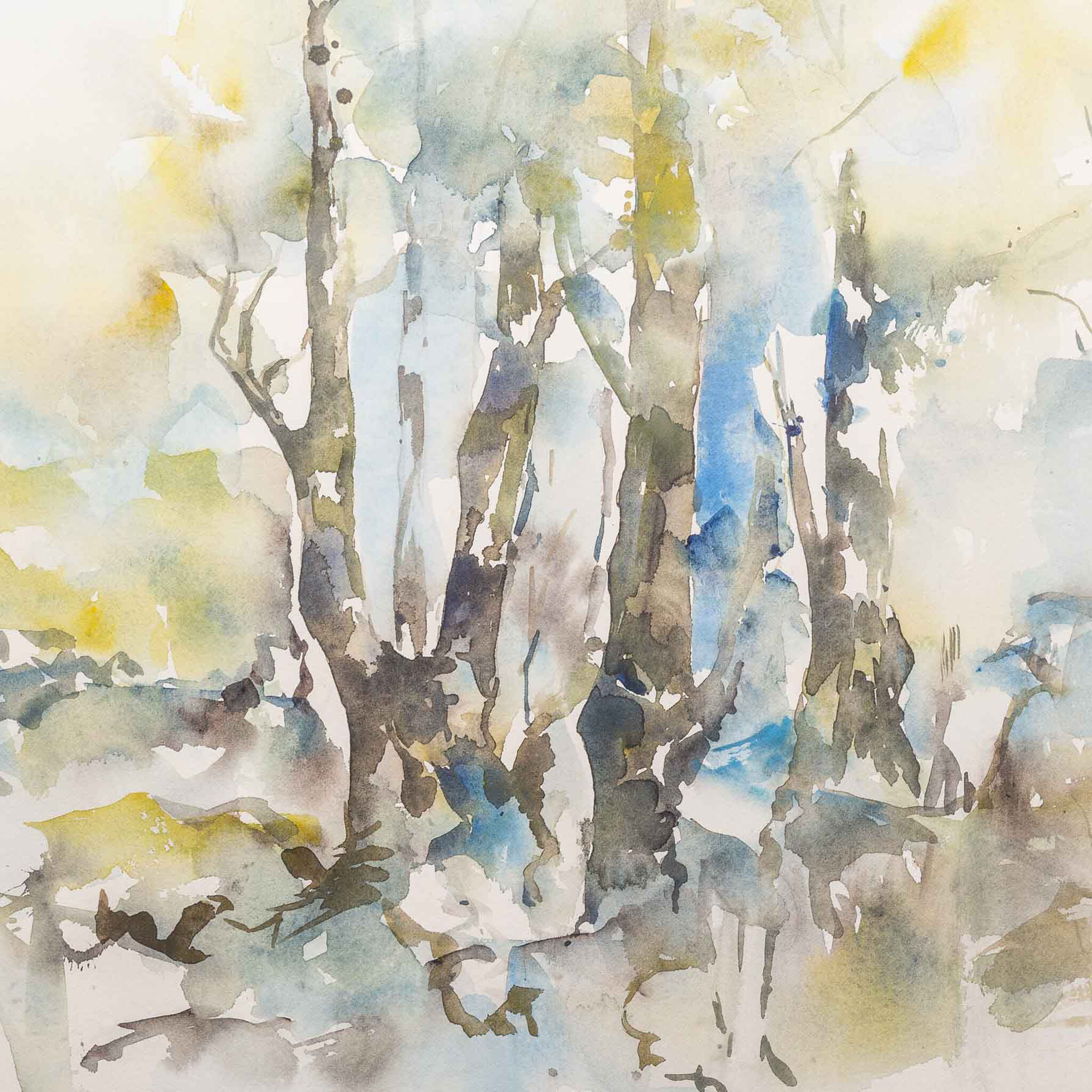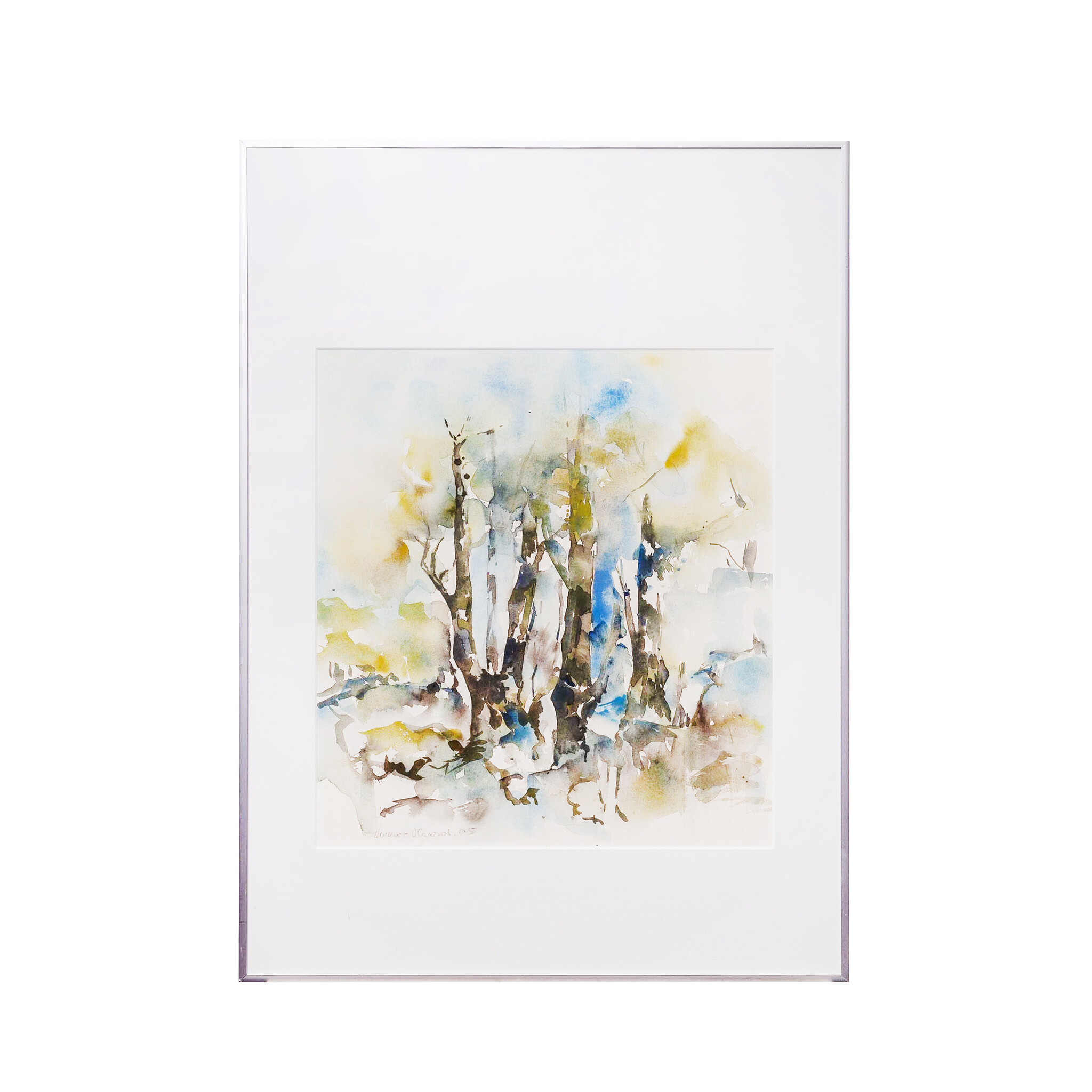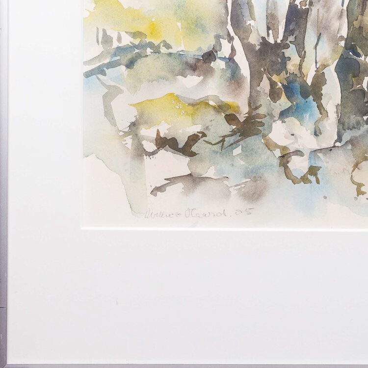Willy van Haard, 'Bomen', 1985. Aquarel op papier in metalen lijst. Schildering van drie bomen voor een blauwe achtergrond. Signatuur linksonder. Conditie: goed, hooguit wat lichte gebruikssporen aan de lijst. Afmetingen incl. lijst: 70 x 50 cm; beeldvlak: 41 x 37 cm.