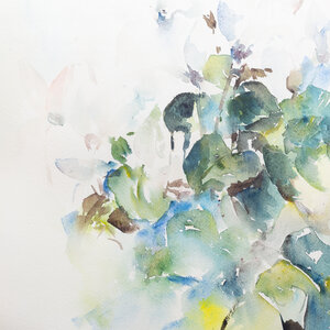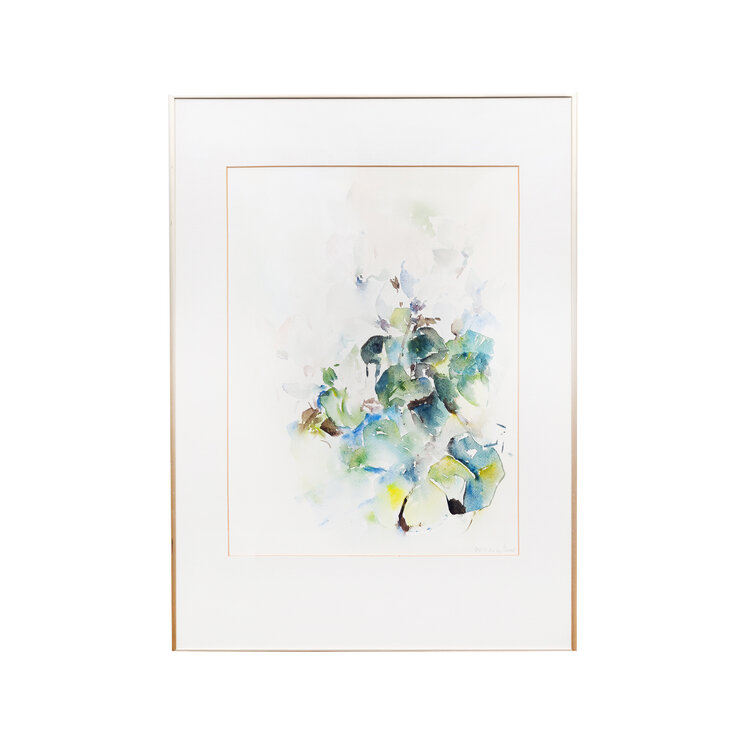 Willy van Haard, 'Cyclaam II'. Aquarel op papier in goudkleurige metalen lijst met passe-partout. Afbeelding van cyclamen in de kleuren lichtroze, groen en blauw. Signatuur rechtsonder. Datering: 1984. Conditie: verkleuring papier en passe-partout, gebruikssporen lijst. Afmetingen lijst: 71 x 50 cm; beeldvlak: 49 x 36 cm.
