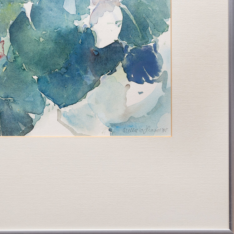 Willy van Haard, 'Witte cyclamen'. Aquarel op papier in metalen lijst met passe-partout. Afbeelding van witte cyclamen met blad in verschillende tinten groen. Signatuur rechtsonder. Datering: 1985. Conditie: verkleuring passe-partout, gebruikssporen lijst. Afmetingen lijst: 70,5 x 50,5 cm; beeldvlak: 42 x 35 cm.