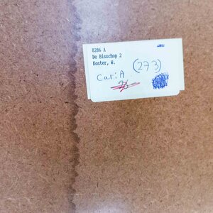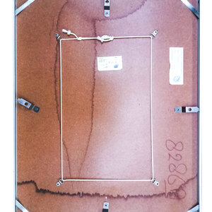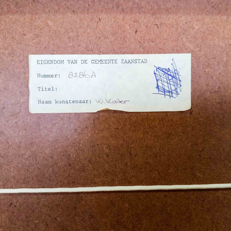 Wim Koster, De Bisschop 2, 1986. Sjabloondruk op papier in metalen lijst, oplage 16/16. Abstracte compositie van vlakken in blauw, paars en roze; voor een donkere achtergrond. Signatuur linksonder. Conditie: Matig glasplaat vies; vocht in werk. Afmetingen: ca. 51,5 x 66 x 2,5 cm.