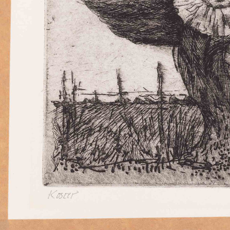 Wim Koster, 'Suffering man', 1972; 'De Engelbewaarder', jaartal onbekend. Twee etsen op papier zonder lijst. 'Suffering man' is een afbeelding van het hoofd van een man met zijn handen in het gezicht. Signatuur linksonder; 'De Engelbewaarder' is een afbeelding van een engel met de vleugels gespreid. Signatuur linksonder. De etsen zijn afgedrukt met zwarte inkt. Conditie: Het papier is vergeeld, heeft punaisegaatjes, taperesten en is bijgesneden. Afmetingen 'Suffering man': ca. 36,5 x 51,5 cm. Afmetingen 'De Engelbewaarder': ca. 19 x 26 cm.
