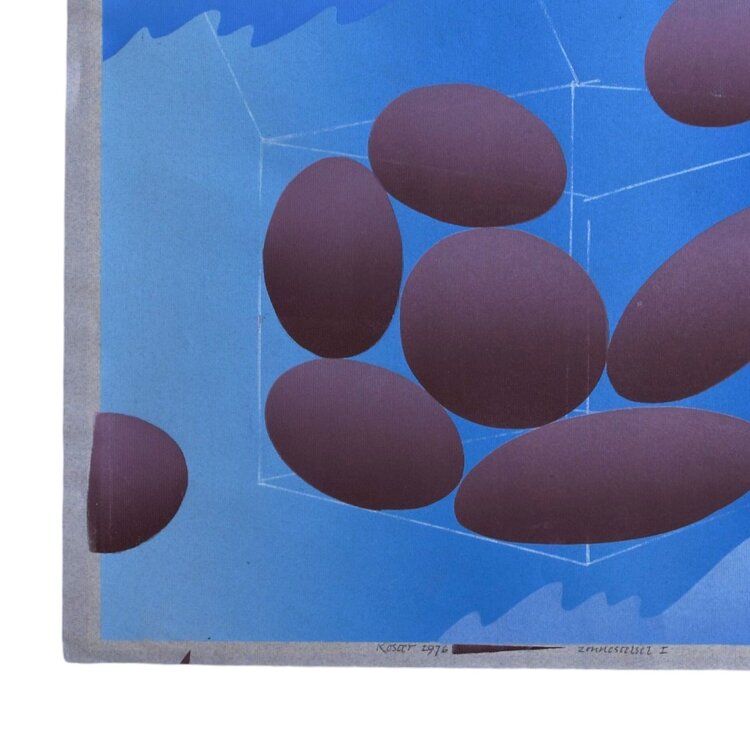 Wim Koster, 'Zonnestelsel I', 1976. Sjabloondruk, een unicaat, op papier zonder lijst. Afbeelding van ovalen in een doorzichtige kubus tegen een wolkenlucht, in de kleuren blauw en bruin. Signatuur linksonder. Conditie: Kleine krasjes in de verf, taperesten op de achterkant. Afmetingen papier: ca 65 x 50 cm.