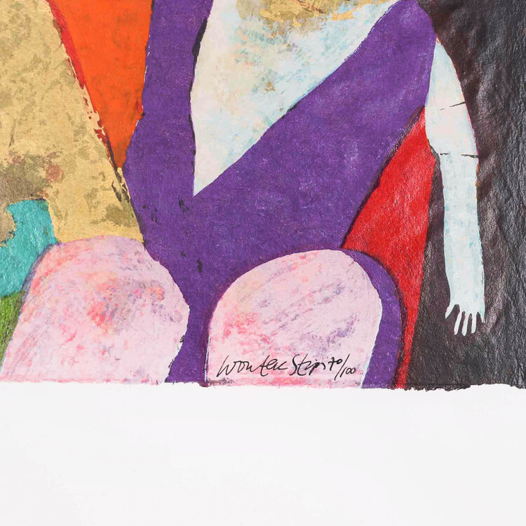 Wouter Stips, Zonder titel, jaartal onbekend. Zeefdruk op papier in metalen lijst, oplage 70/100. Kleurrijke voorstelling voor een donkere achtergrond met twee figuren. Rechtsonder signatuur en oplagenummer. Conditie: goed, gebruikssporen aan lijst. Afmeting werk zonder lijst: 32 x 42 cm.
