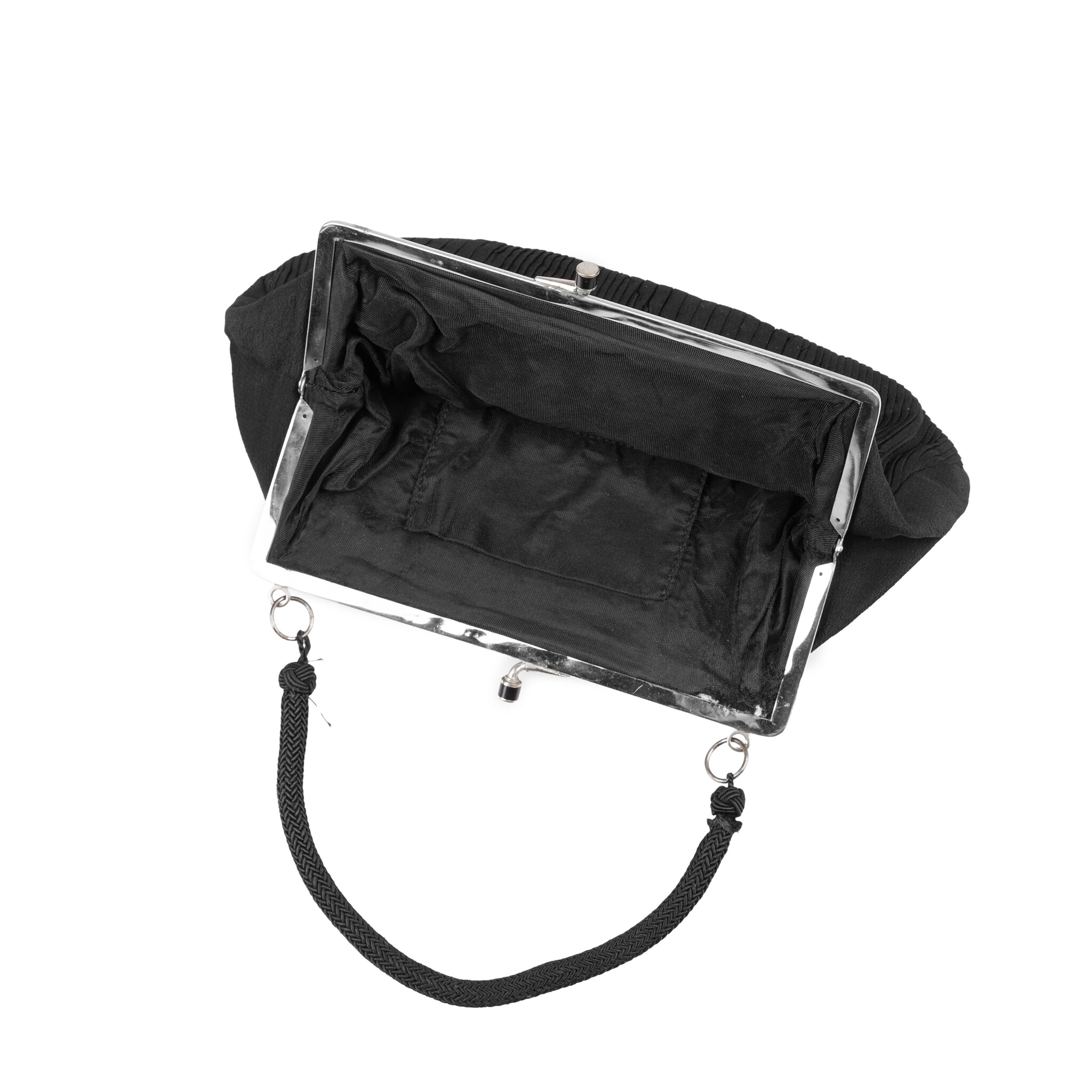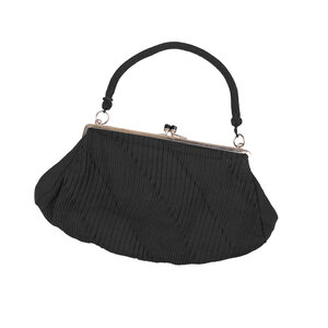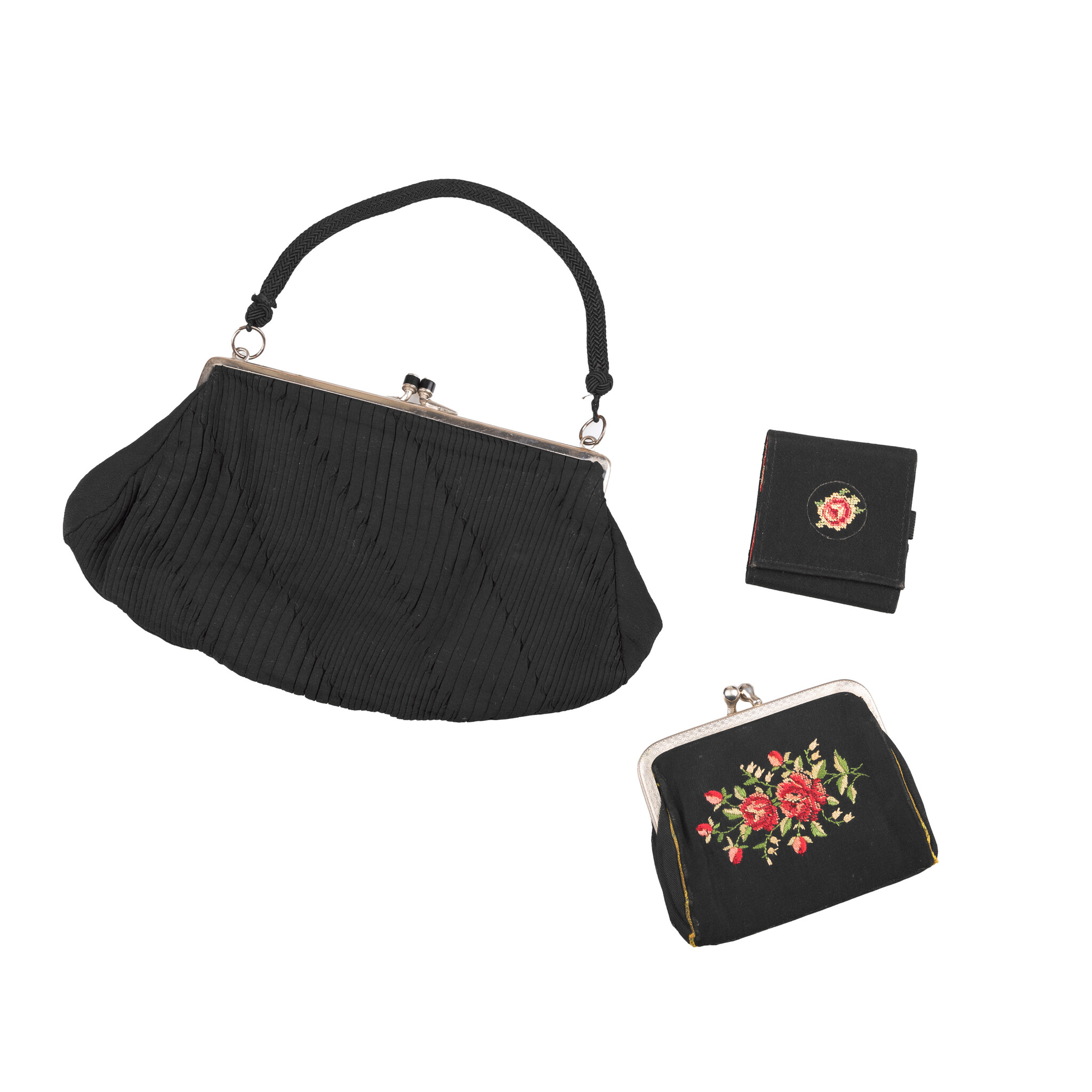 Zwarte clutch, portemonneetje en etuitje, 20ste eeuw. De zwarte clutch van textiel waarvan de voorzijde is geplooid, heeft een zilverkleurige beugelsluiting; Het zwarte portemonneetje heeft aan de voorzijde een borduursel van een bloempatroon in petit poi