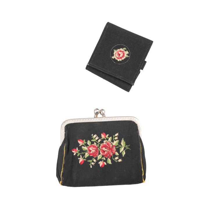Zwarte clutch, portemonneetje en etuitje, 20ste eeuw. De zwarte clutch van textiel waarvan de voorzijde is geplooid, heeft een zilverkleurige beugelsluiting. Het heeft een polsband en is aan de binnenzijde gevoerd met een zwarte voering met opbergvakje; Het zwarte portemonneetje heeft aan de voorzijde een borduursel van een bloempatroon in petit point steek en een rode binnenvoering; Het zwarte etuitje heeft voorop een bloemenborduurwerkje en is uitklapbaar. Aan de rode binnenzijde zitten drie opberglusjes. Conditie: vertonen sporen van gebruik en ouderdom. Afmetingen tas: ca. 12 x 22 x 1 cm. Afmetingen portemonnee: ca. 8 x 9 x 1 cm. Afmetingen etui: ca. 6 / 15 x 5,5 x 1 cm.